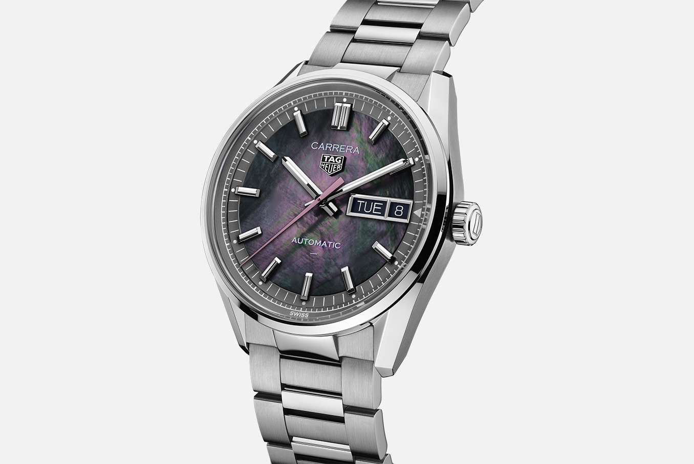 自動巻, 41 mm, ステンレススティール WDA2116.BA0043桜から着想を得た日本限定モデル タグ・ホイヤー カレラ デイデイト ジャパン リミテッドエディション。ブラックマザーオブパール(黒蝶貝) のダイヤルは光の加減や見る角度によって幻想的な輝きを放ち、ピンクの秒針をポイントとしてあしらっています。41mmと36mmの2サイズで展開している2つのモデルはペアウォッチとしてお使いいただくのもおすすめです。41mmモデルは200本のリミテッドエディションです。