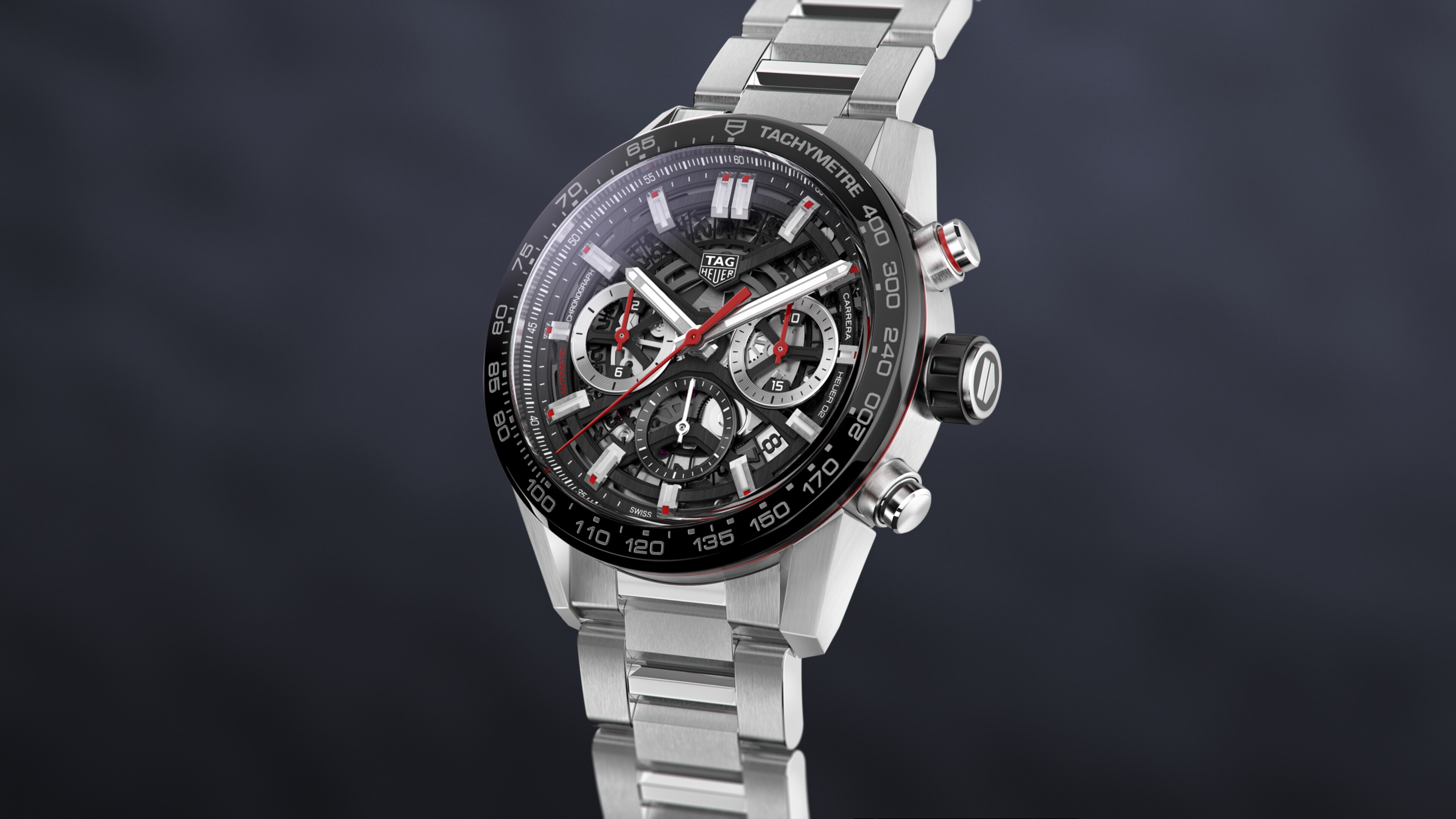 一線を越える: 43㎜クロノグラフの非常にモダンなスケルトンダイアルは、シルバートーンとレッド微妙なタッチがデザインにめりはりを付け、タグ・ホイヤー カレラが受け継ぐモーターレーシングのレガシーを強調しています。
