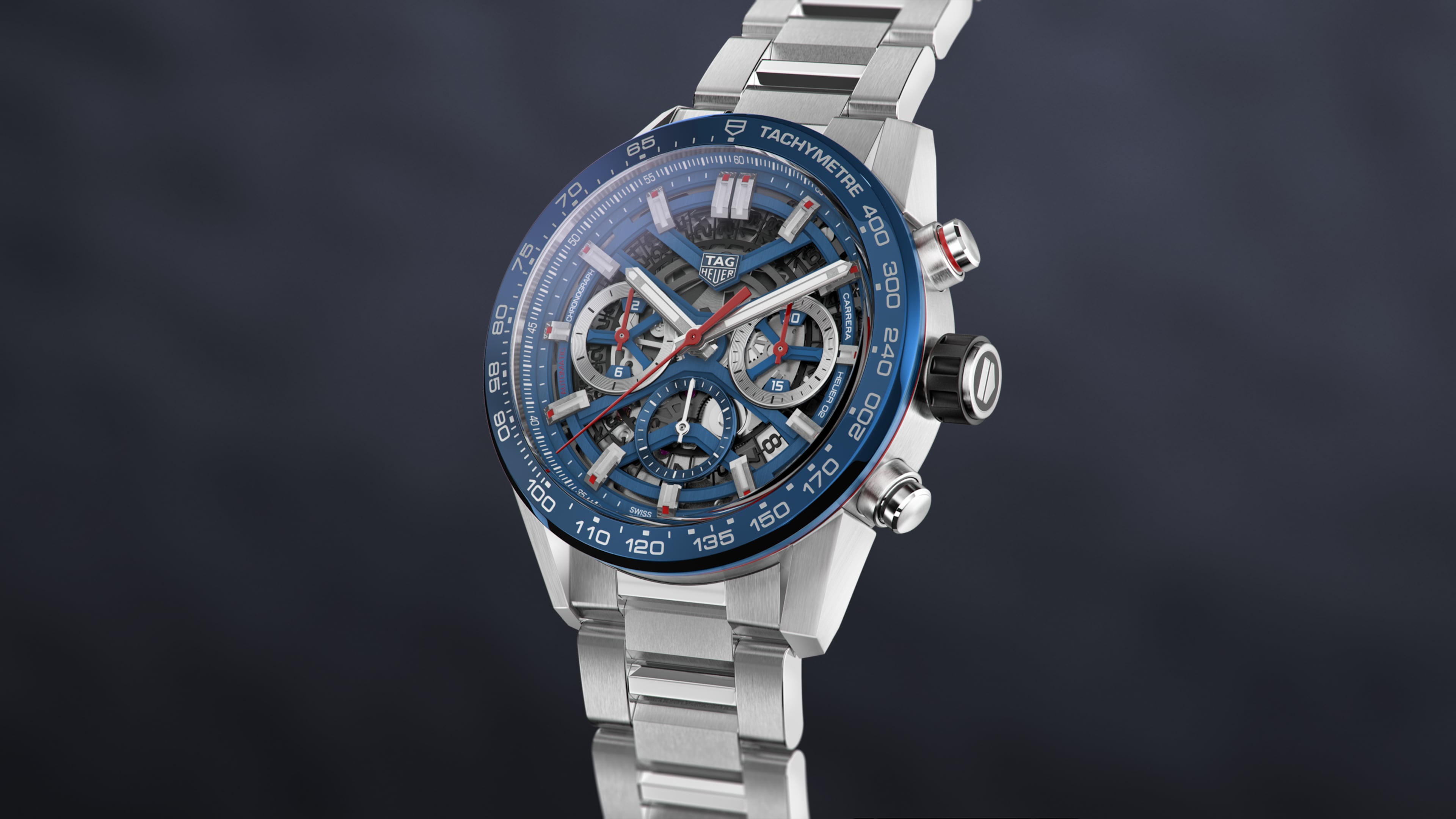100mの防水性で、スケルトンダイアルとねじ込み式サファイアケースバックから、80時間のパワーリザーブ機能を搭載した自社製ムーブメント、ホイヤー02による素晴らしい景色を眺めることができます。