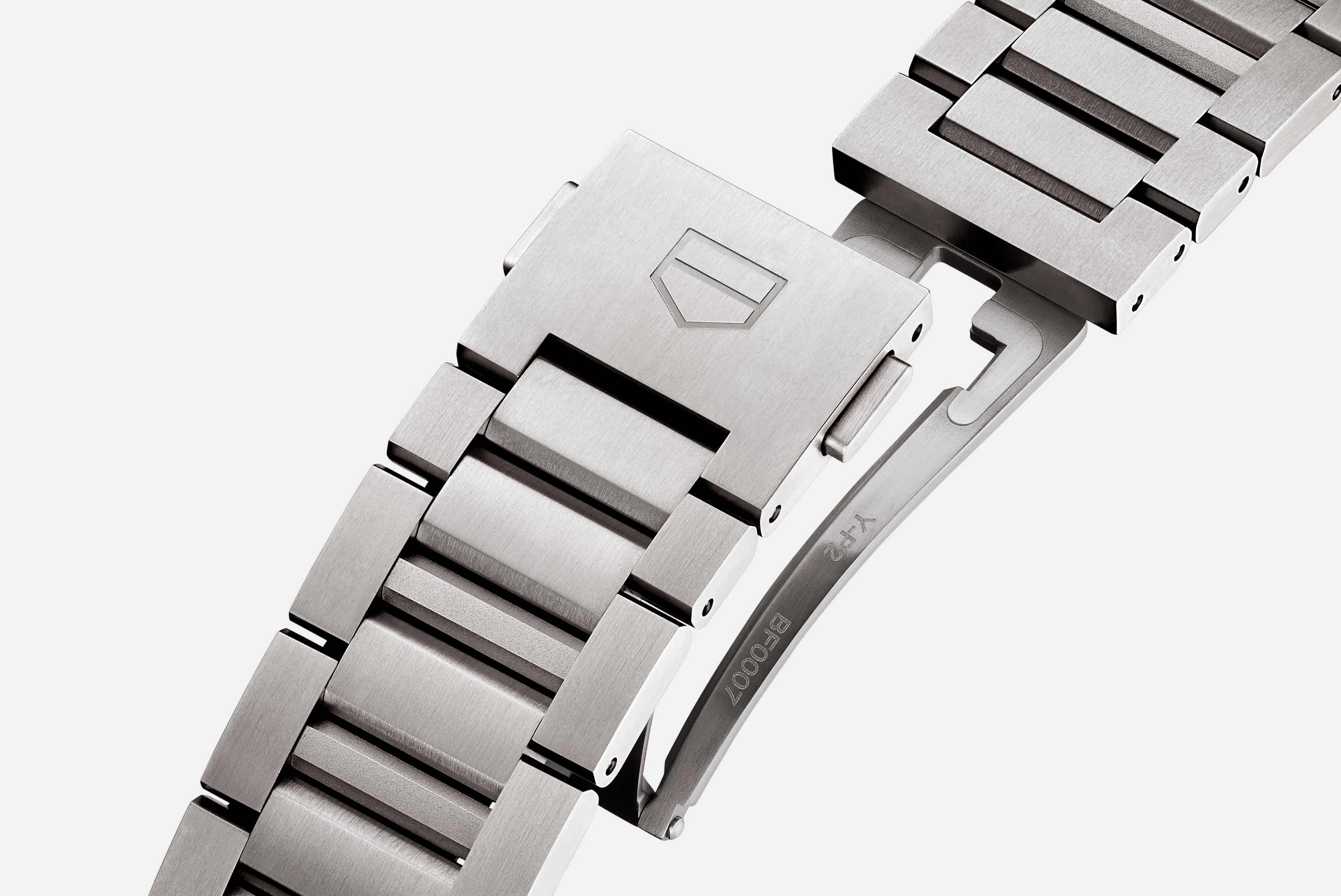 サテン仕上げを施したグレード2チタン製H型ブレスレットが、動きの中でも着け心地を保ち、ウォッチをしっかりと固定。サテン仕上げのチタン製フォールディングバックルとダブルセーフティプッシュボタンが付き、スポーツウェアの上から着用するときも日常のスタイルに合わせるときも、正確で信頼性の高いフィットを叶えます。