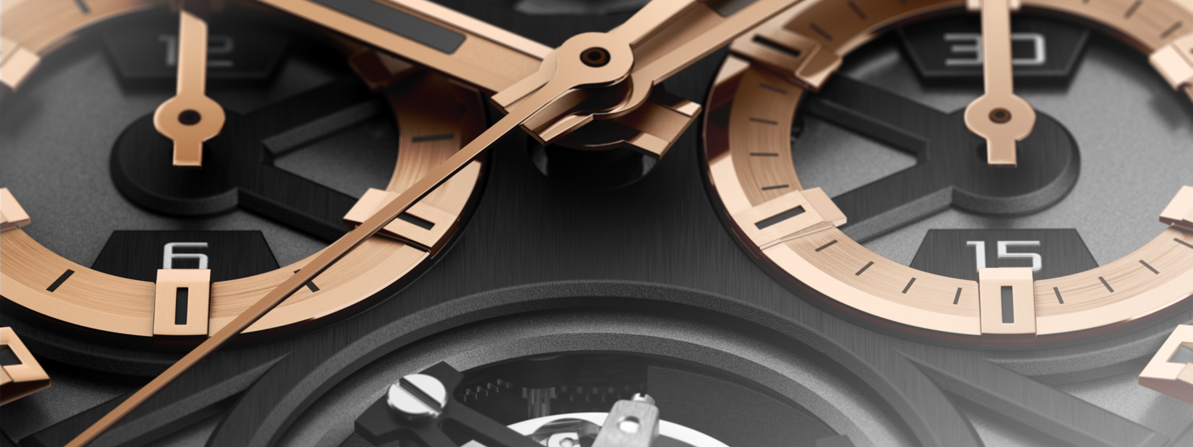 3時位置と9時位置のクロノグラフ分とクロノグラフ時を計測するサブダイヤルは、ローズゴールドトーン。 1分間で1回転するフライングトゥールビヨンは、6時位置で表示。 スーパールミノバ®を針と、ポリッシュ/サテン仕上げのバトン型インデックスに塗布。