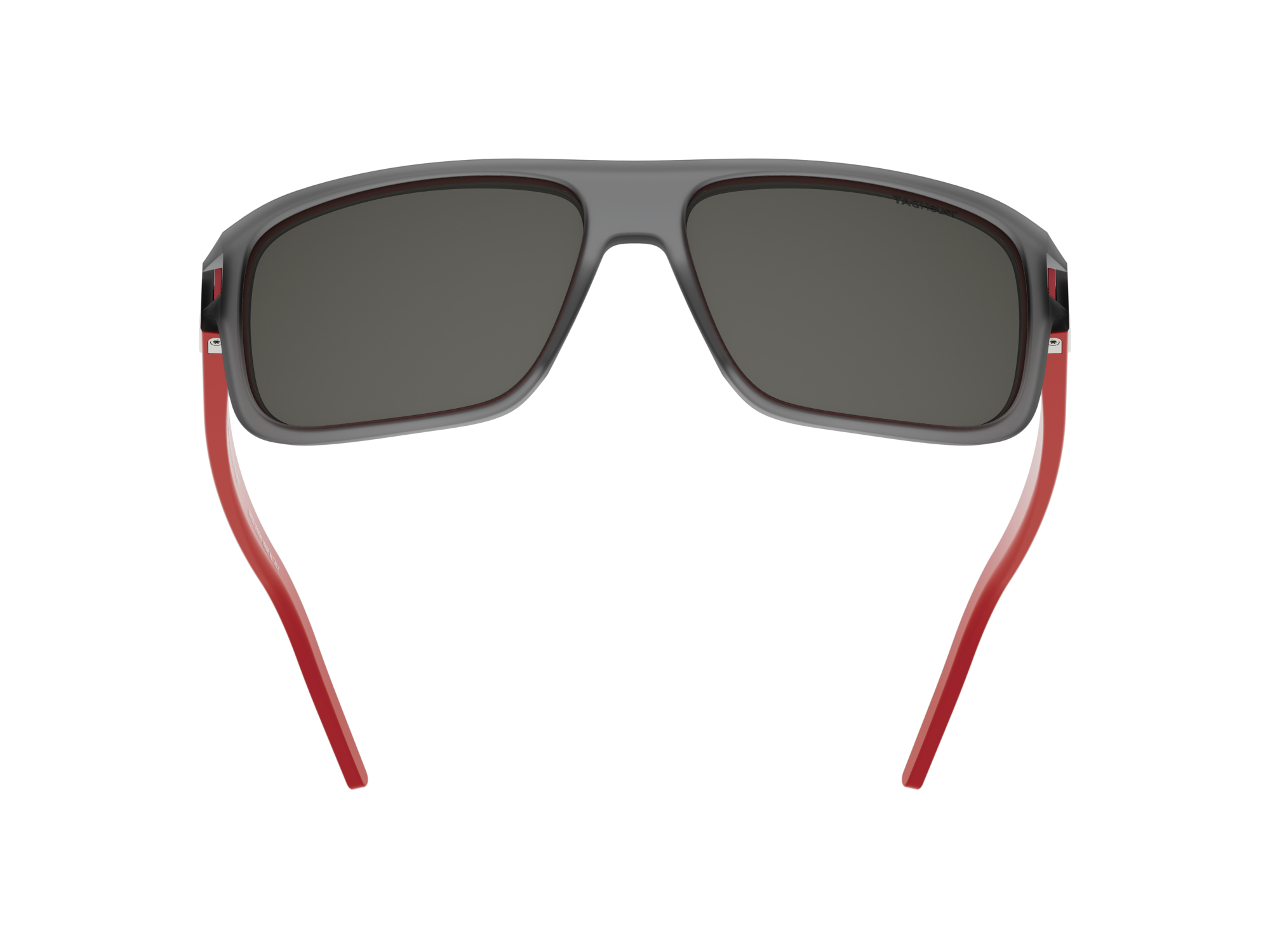 The semi-matte transparent grey bio-nylon front face delivers both resilience and subtle sophistication. Rubberized elastomer temples in striking red add dynamic contrast and grip, while adjustable rubberized bio-nylon nose pads ensure long-lasting comfort and a secure fit.