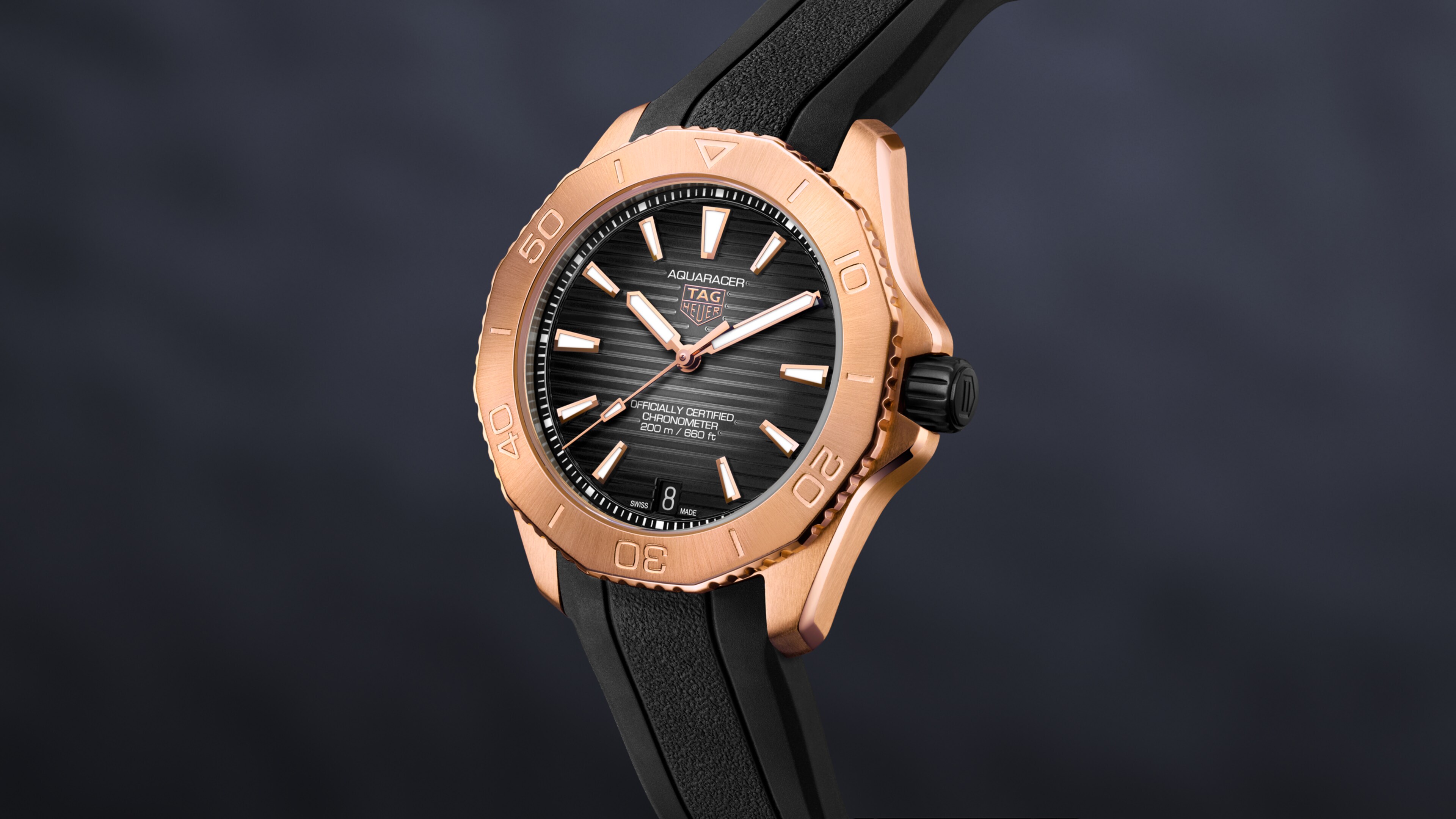 Automatic, 40 mm, 18K 5N gold WBP5150.FT6199Combining noble materials such as 18K 5N solid rose gold and titanium grade 2 with high-tensile rubber, this TAG Heuer Aquaracer makes sheer elegance go hand in hand with extreme performance and versatility. Water-resistant to 200 metres and ready to raise the bar.