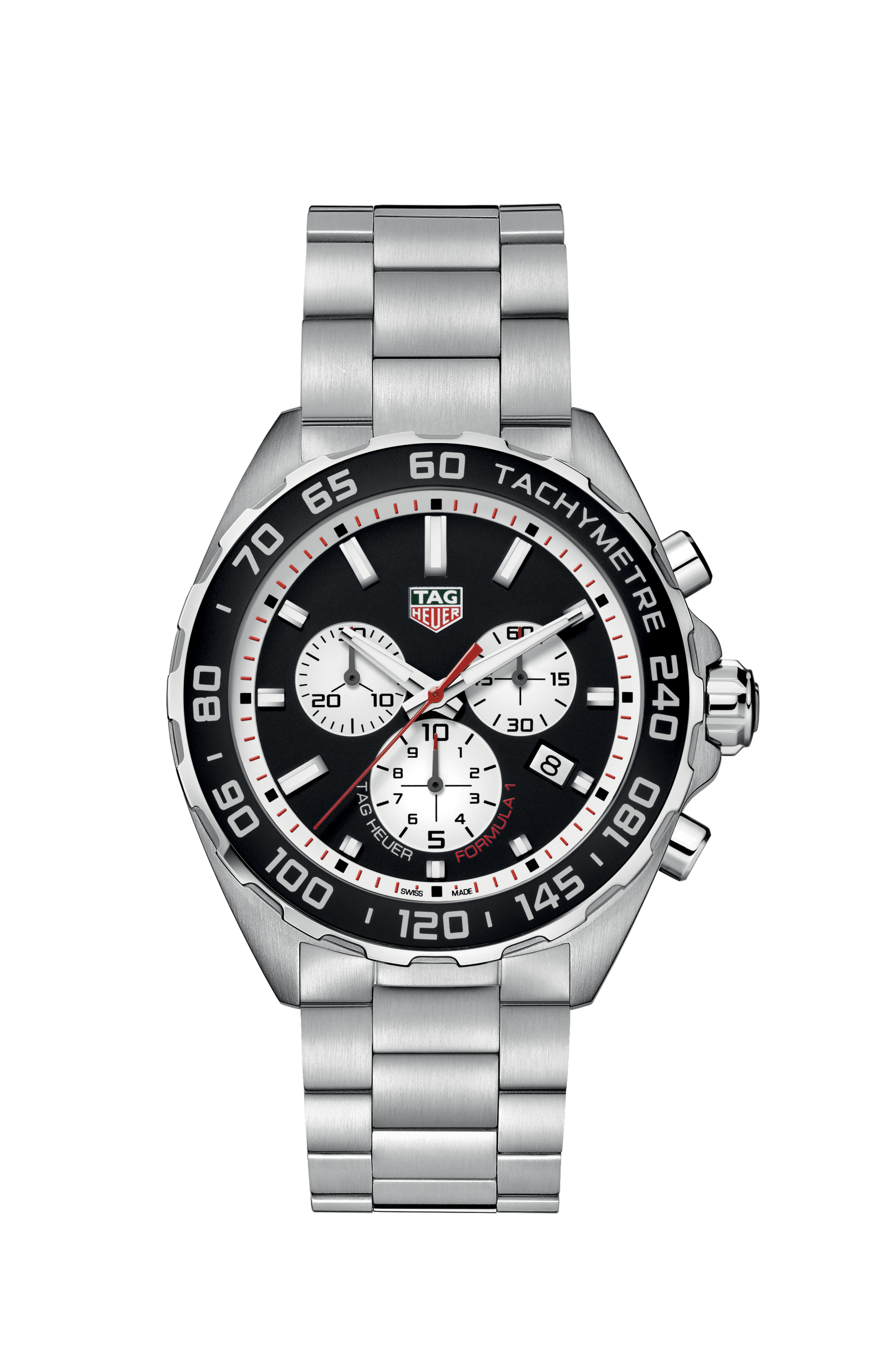 Gentlemen, start your engines: the 43mm steel case is matched with a black bezel tachymetre for measuring speed over distance.