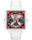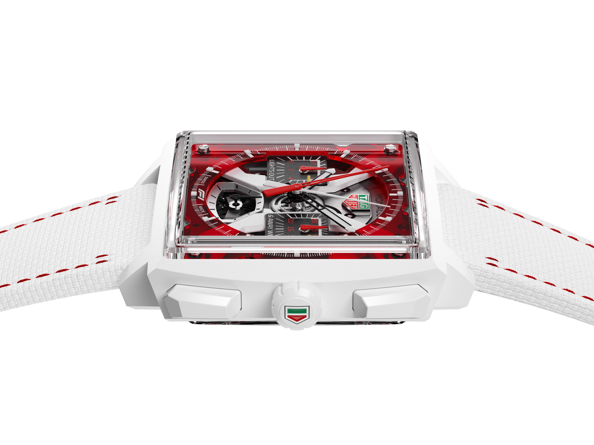 화이트 컬러의 세라믹 케이스와 조화를 이루는 크라운 및 푸쉬버튼은 하나의 세라믹 블록으로 제작되며, 전체 수작업으로 마감되어 완벽한 품질과 최적화된 인체공학적 디자인을 완성합니다. 이와 어우러지는 화이트 세라믹 아치가 공기역학적 실루엣을 더욱 돋보이게 하는 한편, 크라운 위에 래커 처리된 그린과 레드 컬러의 태그호이어 방패 문장은 다이얼 중앙의 로고를 떠올리게 합니다. 시계에는 더블 폴딩 클래스프를 갖춘 고성능 스트랩이 장착되어 편안하면서도 안정적인 착용감을 선사합니다.