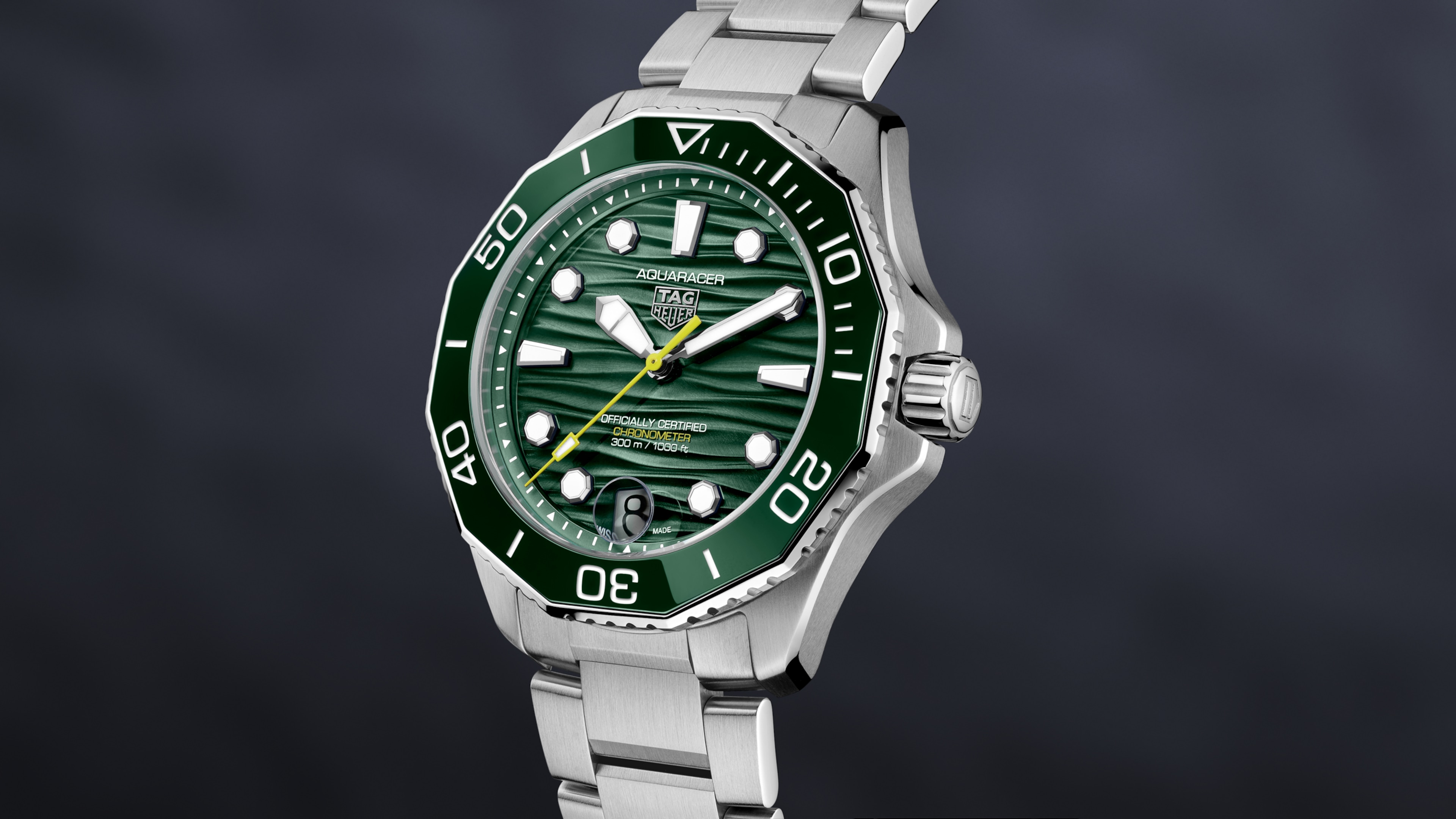 물결 패턴이 장식된 딥 그린 다이얼은 수퍼 루미노바® 처리된 핸즈와 인덱스를 갖추어 뛰어난 가독성을 선사하며, 선명한 라임 그린 컬러의 세컨즈 핸드는 미스터리한 바닷속 세계에 찬사를 보냅니다.