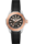The slightly fumé black mother-of-pearl dial proudly distills its beauty with eleven stunning VS 1.4mm-diametre diamond indexes (0.107ct) and 18K 5N rose gold-plated touches.