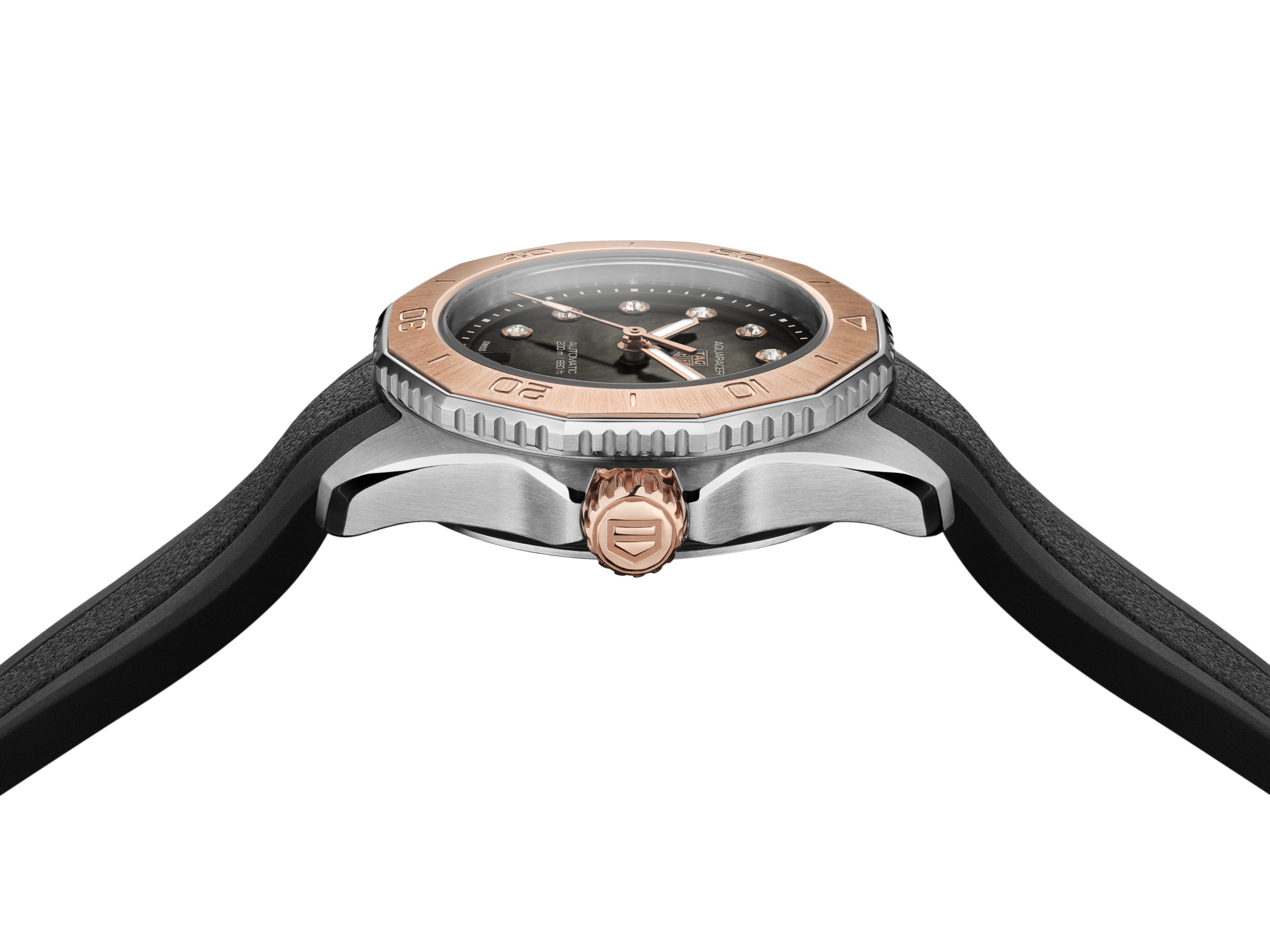 Elegance shines through every detail of this superior TAG Heuer Aquaracer, where 18K 5N solid rose gold and shimmering VS 1.4mm-diametre diamonds (0.107 ct) have pride of place. With its smoky-black dial and matching resilient rubber strap, it is set to go further than ever.