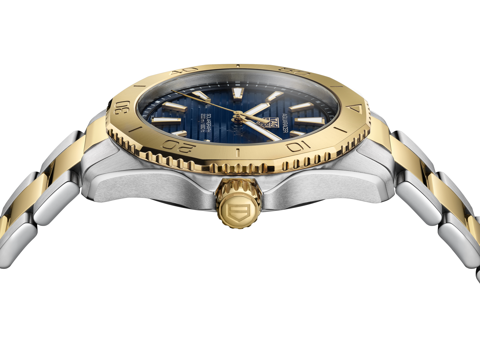 Das beeindruckende blaue Zifferblatt mit gebürstetem Sonnenschliff wird durch 18K 2N gelbvergoldete Indexe und Zeiger mit weißer Super-LumiNova®-Füllung ergänzt, die maximale Ablesbarkeit und Zuverlässigkeit unter allen Bedingungen garantieren.