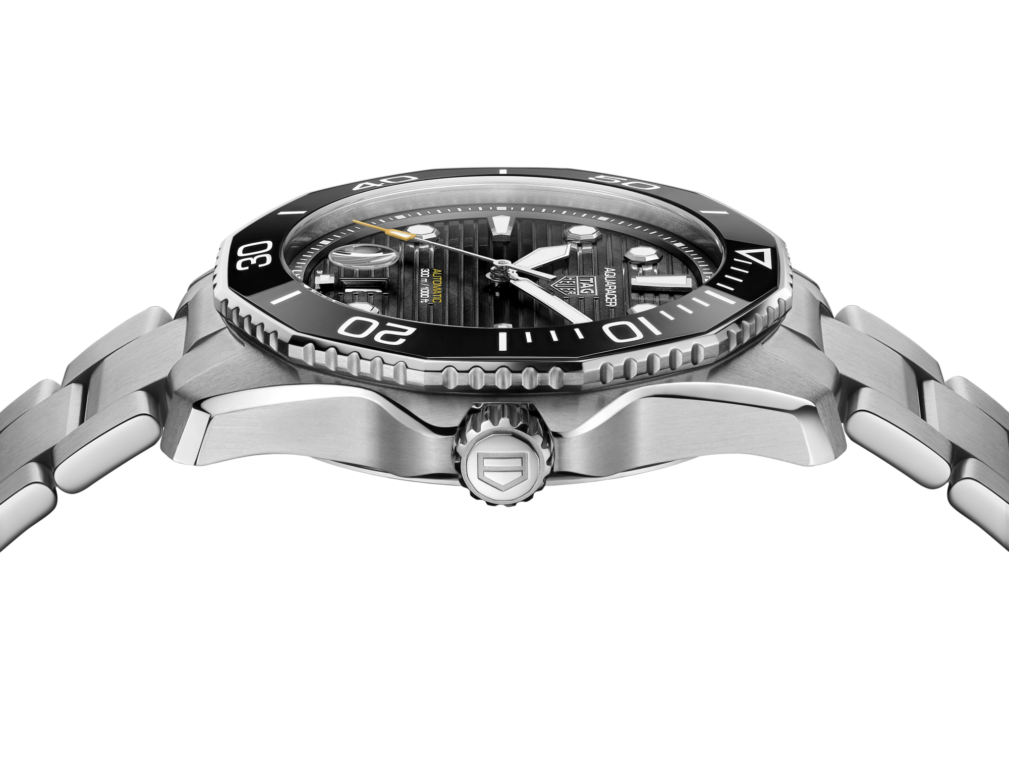 Techniquement robuste et avec une ergonomie améliorée, une lunette unidirectionnelle en céramique avec une échelle de plongée s'harmonise parfaitement avec le cadran et les index octogonaux.