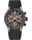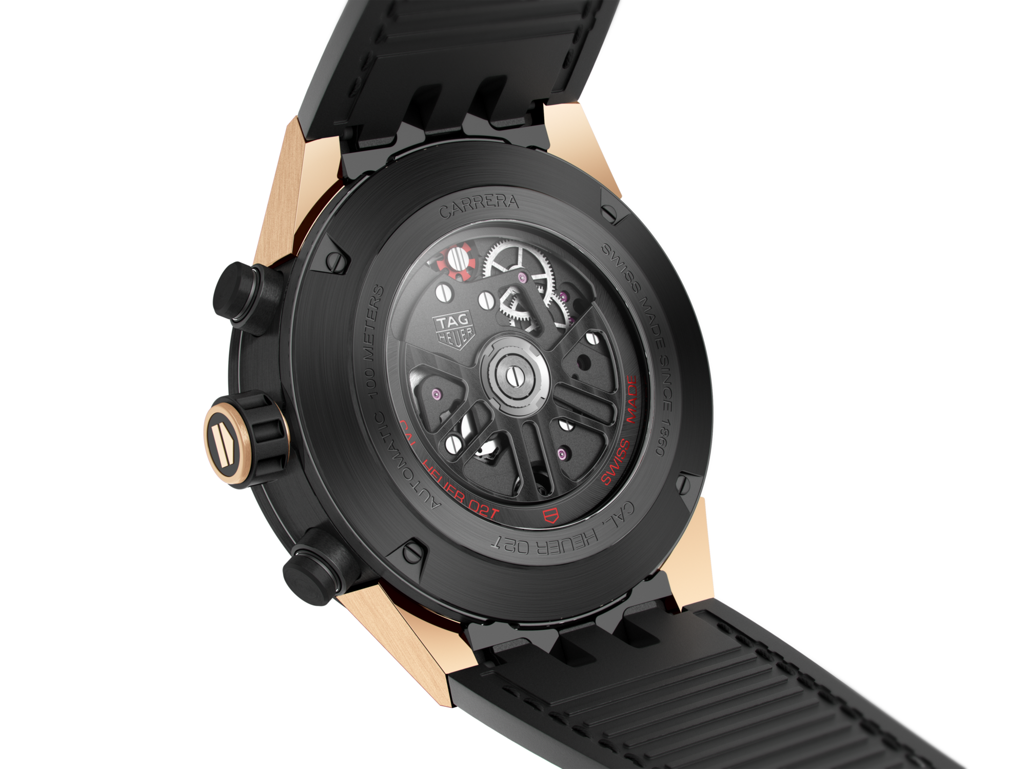Le boîtier à un diamètre de 45 mm. Etanche à 100 mètres, il est élégamment attaché à un bracelet en cuir noir mat en alligator, cousu sur du caoutchouc noir. La lunette est en céramique noire.