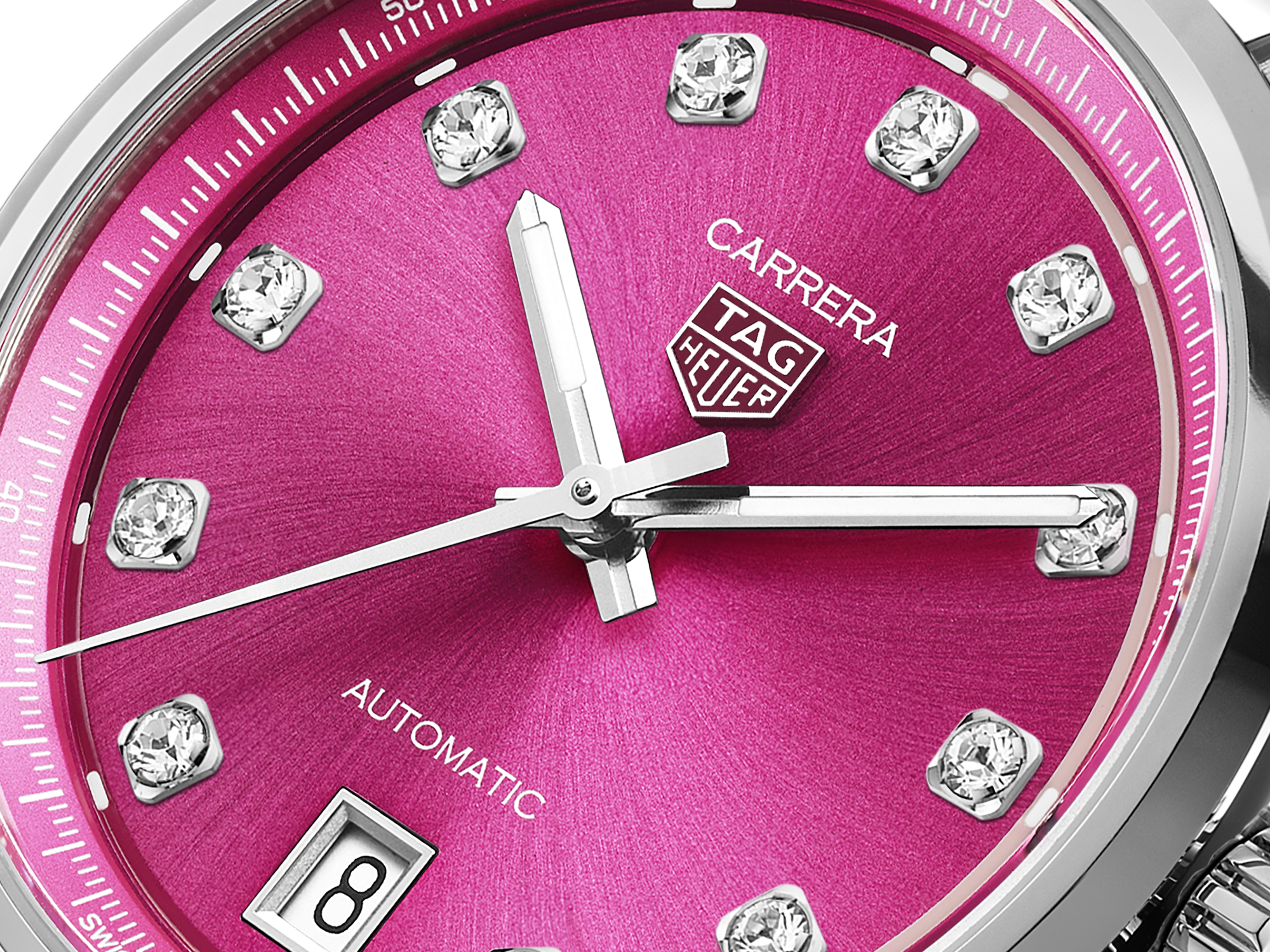 The dial's intense pink hue is complemented by rhodium-plated, facetted, and polished hands filled with white SuperLuminova®, ensuring clarity and a touch of glamour under any lighting conditions.