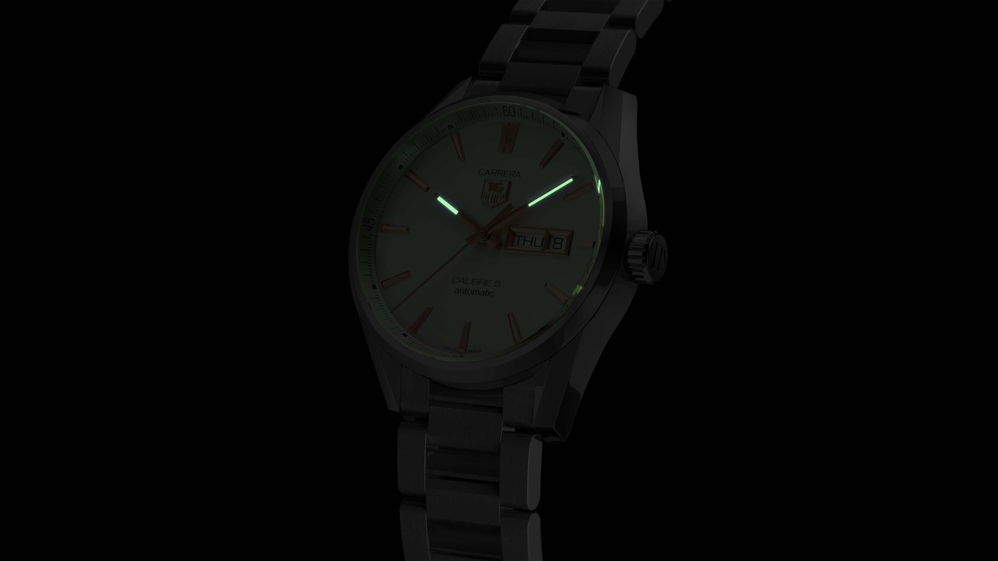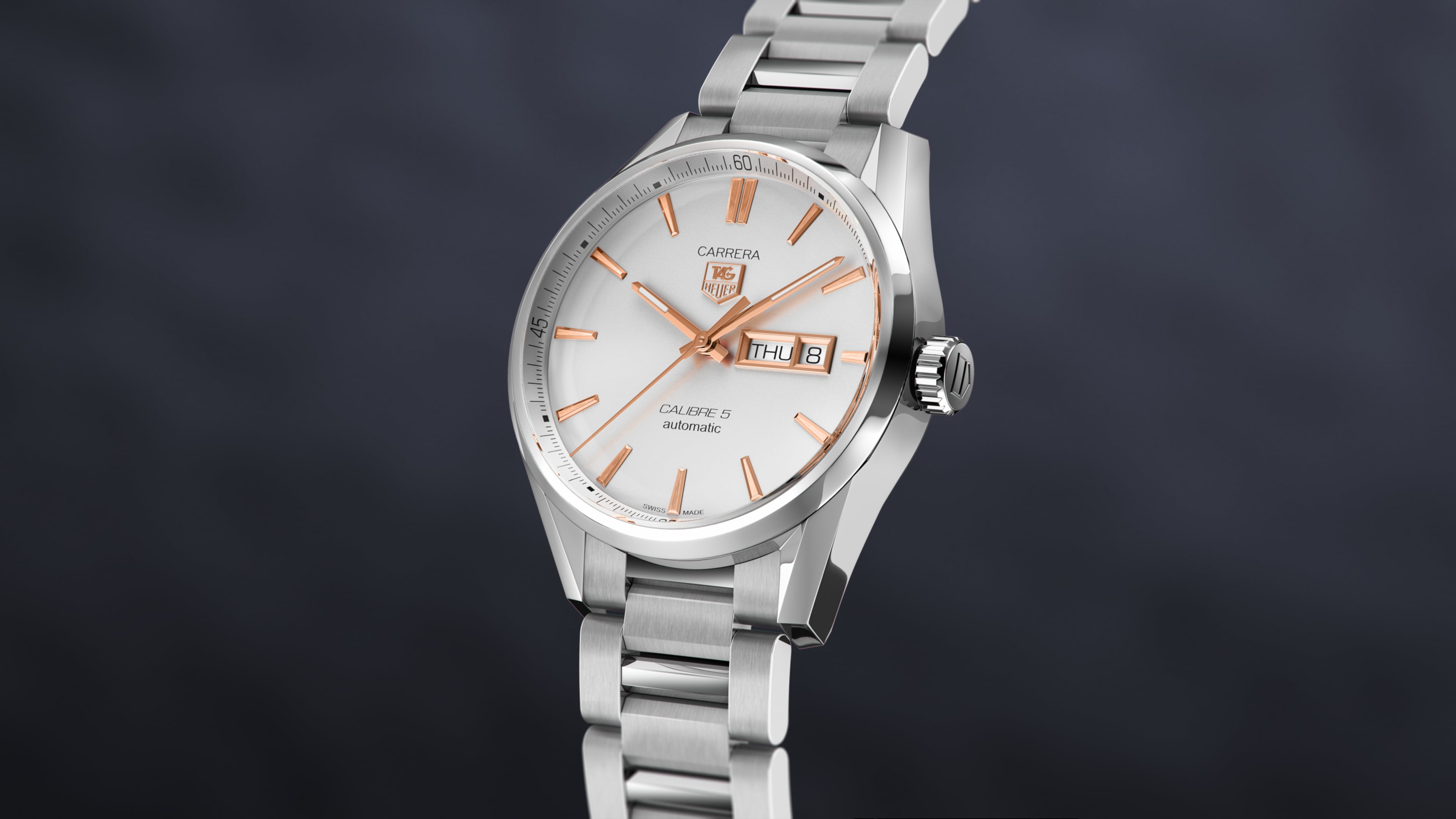 Rose-gold elements on the white dial design including the hands, the polished, hand-applied TAG Heuer shield, the angled day-date window at 3 o’clock and the polished baton-shaped indexes.