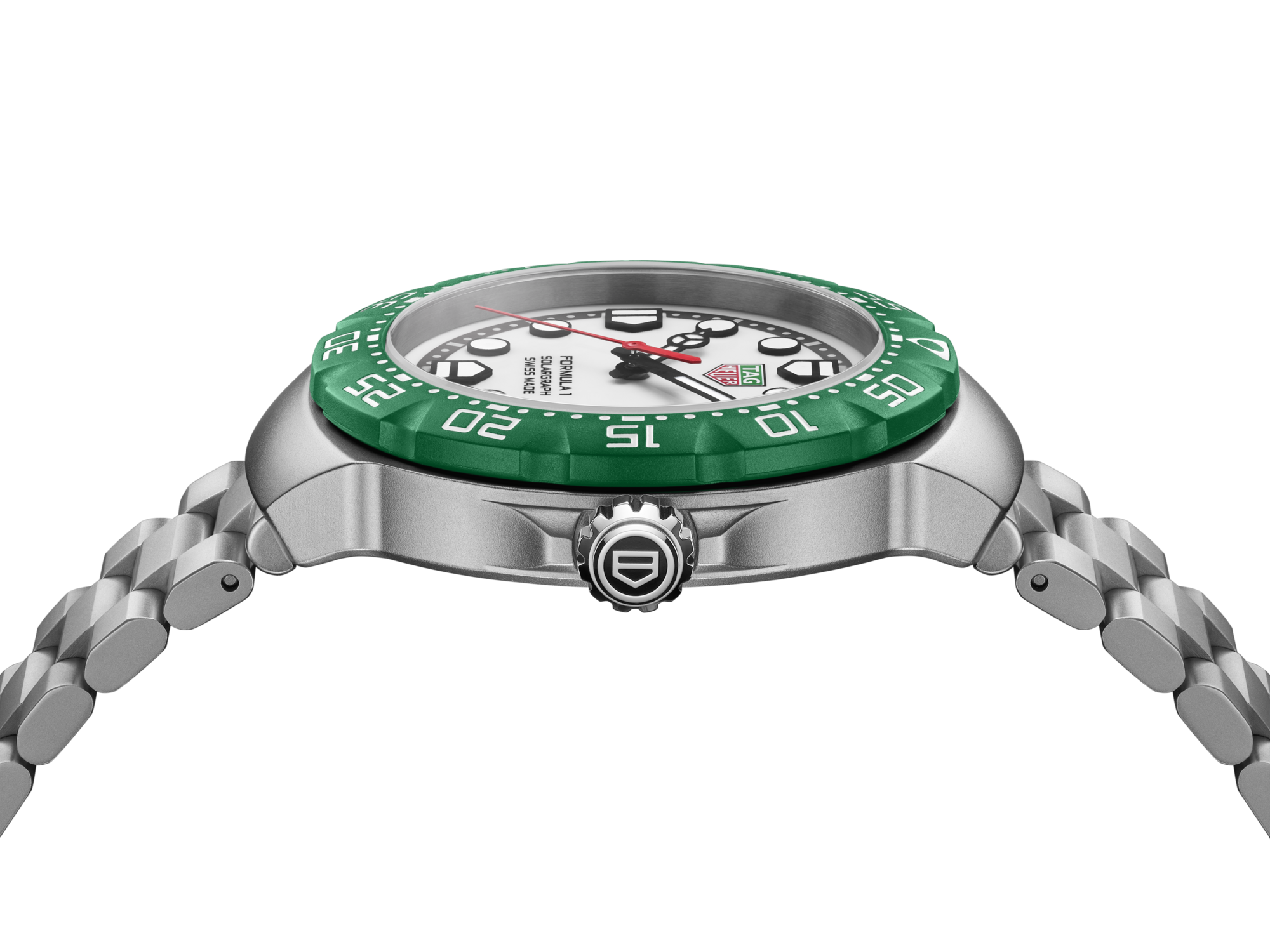 Powered by the in-house Calibre TH50-00, this 38mm TAG Heuer Formula 1 Solargraph channels the brand’s racing heritage into a compact, high-energy design. Inspired by pitlane clocks, the watch’s red, green, and white accents echo the Swiss Maison’s motorsport roots, capturing both color and speed in motion.
