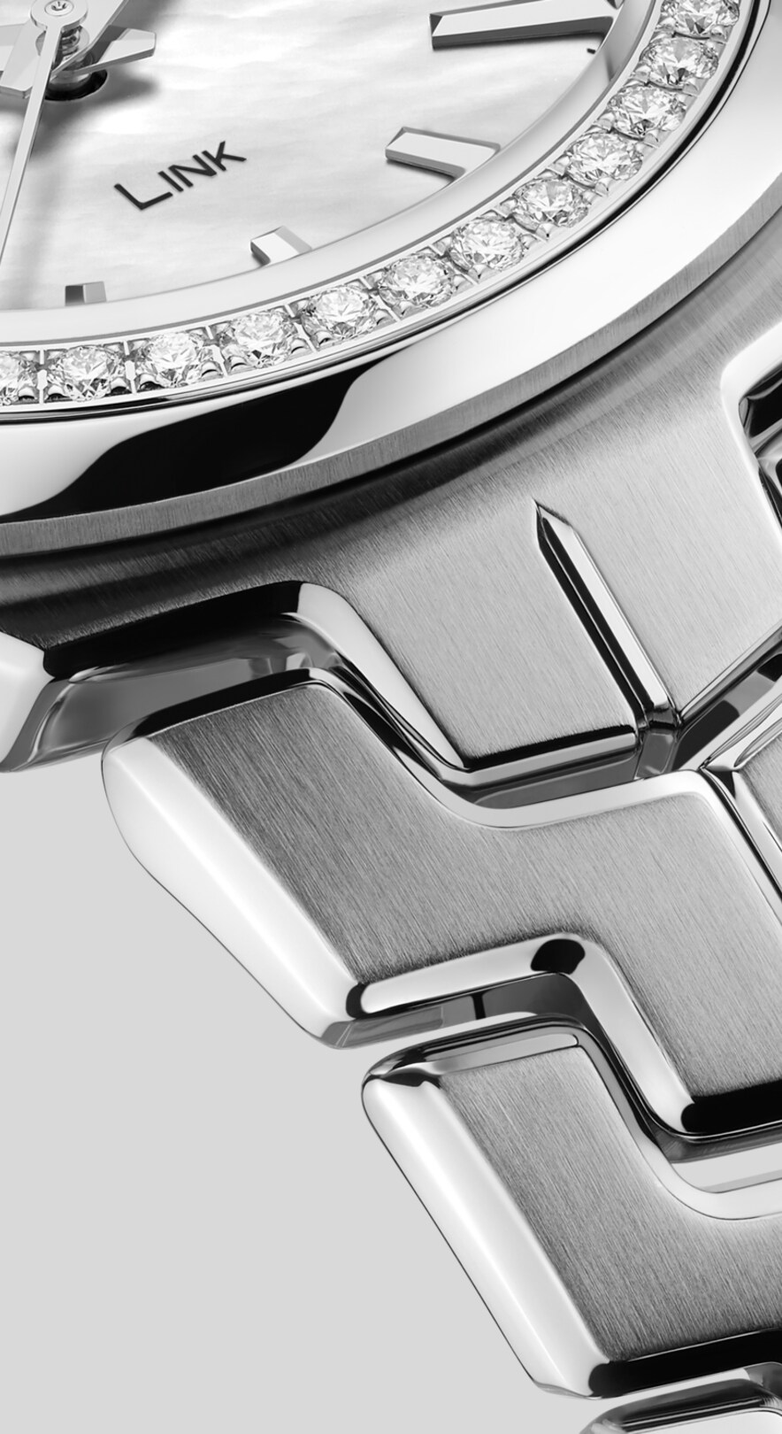 Quartz, 32 mm, Steel WBC1314.BA0600A haute-couture edition of the Link Lady Quartz. The white mother-of-pearl dial is highlighted by silver-toned details and the fixed bezel is circled with shimmering diamonds (0.676 CT).