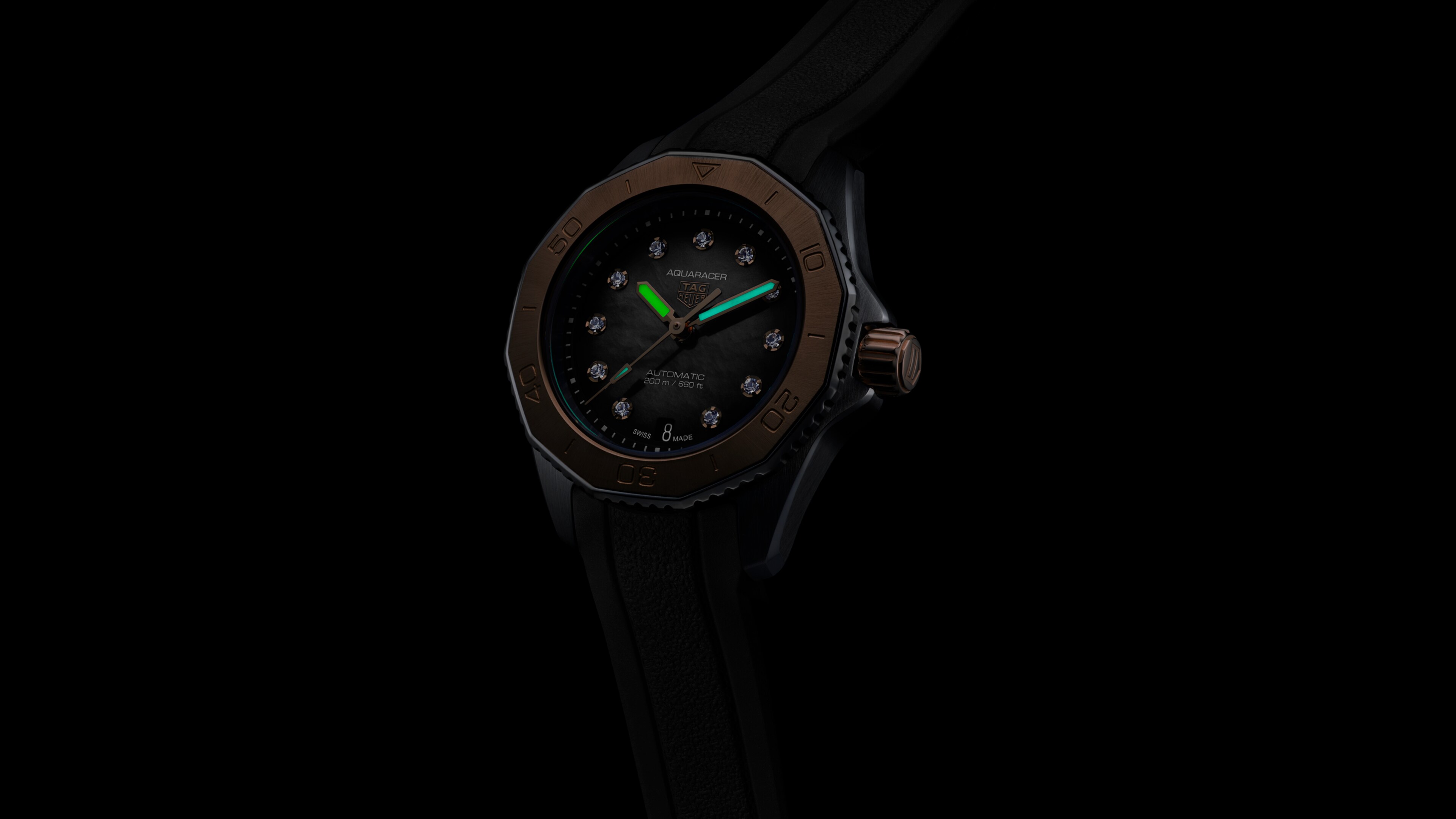 Automatique, 30 mm, Acier WBP2451.FT6200Entre or rose massif 18K 5N et diamants VS de 1,4 mm de diamètre (0,107 ct), cette TAG Heuer Aquaracer dont chaque détail respire l'élégance associe un cadran noir fumé à un robuste bracelet en caoutchouc assorti pour vous accompagner toujours plus loin.