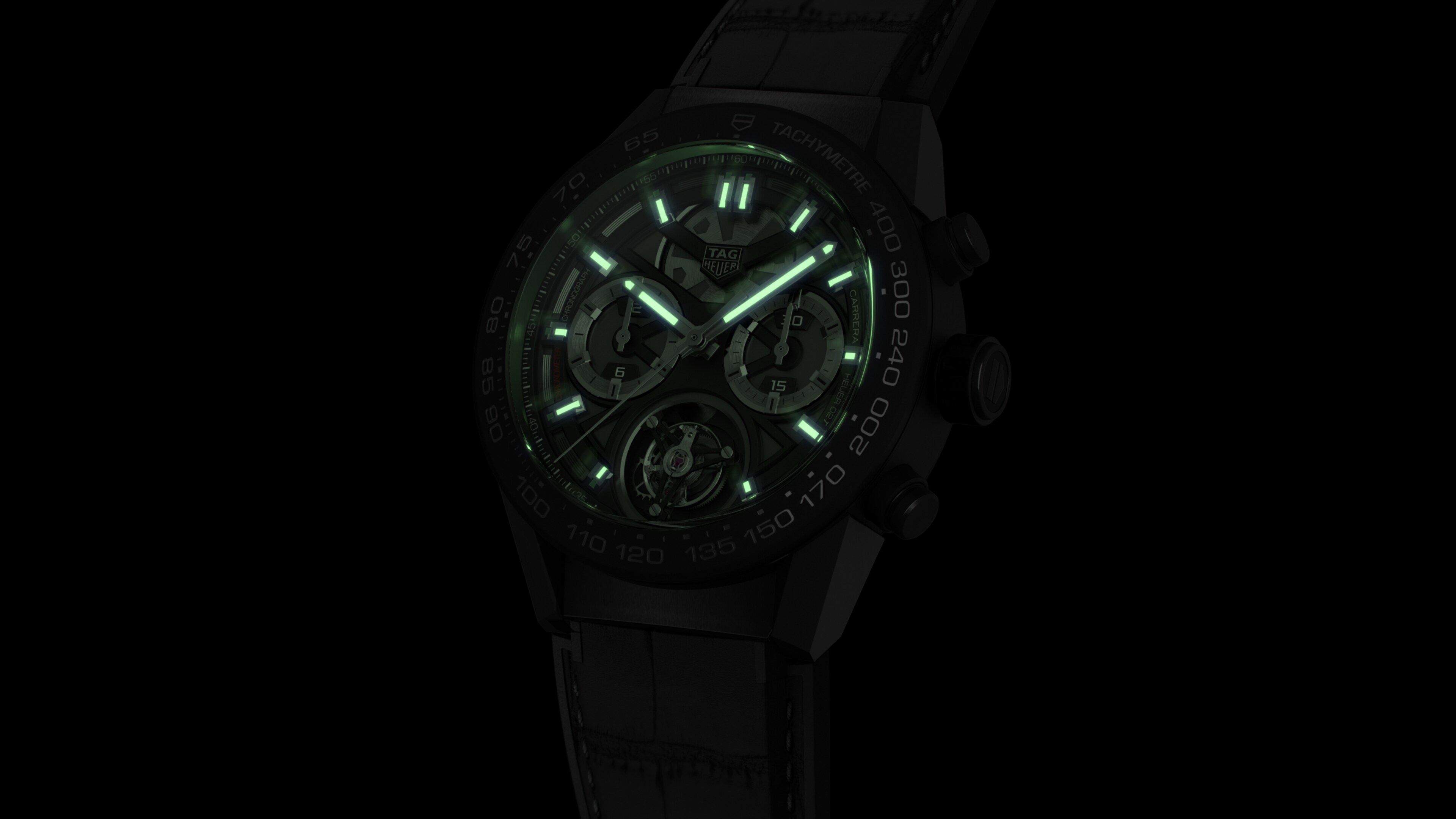 Le design squeletté du cadran rappel l'attachement de la collection TAG Heuer Carrera aux sports automobiles. La cage-tourbillon noire se dévoile à travers une grande fenêtre circulaire à 6 heures.