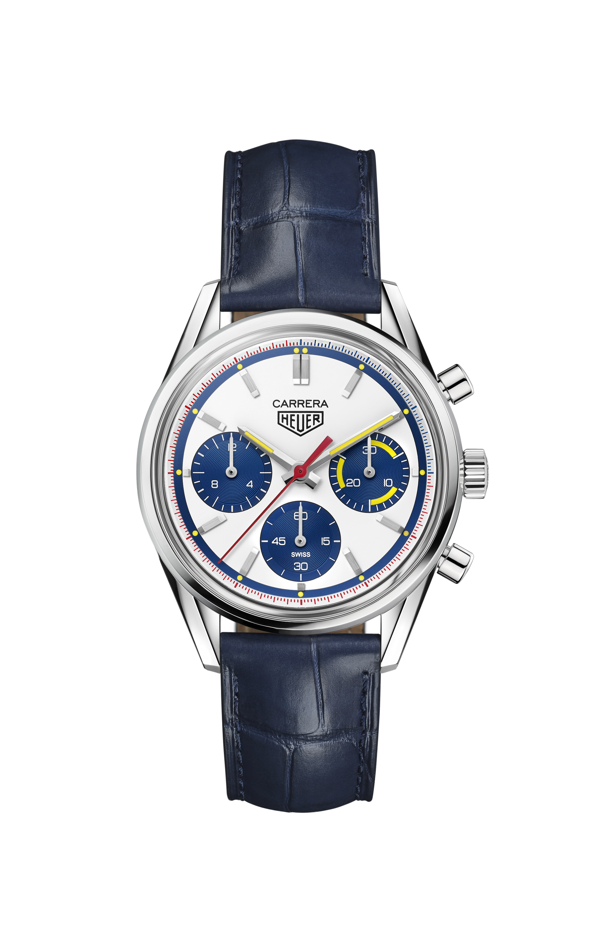 Il rehaut della scala di un colore bianco sobrio con leggeri tocchi di blu e rosso, la lancetta centrale rossa, le lancette delle ore e dei minuti gialle rivestite con Super-Luminova® e il contatore cronografico delle ore: questo segnatempo è ispirato al modello Heuer Carrera Montreal degli anni '70, un segnatempo diventato iconico 60 anni fa, che ha portato avanti nel corso dei decenni la sua tradizione legata al mondo delle corse e il suo spirito audace.