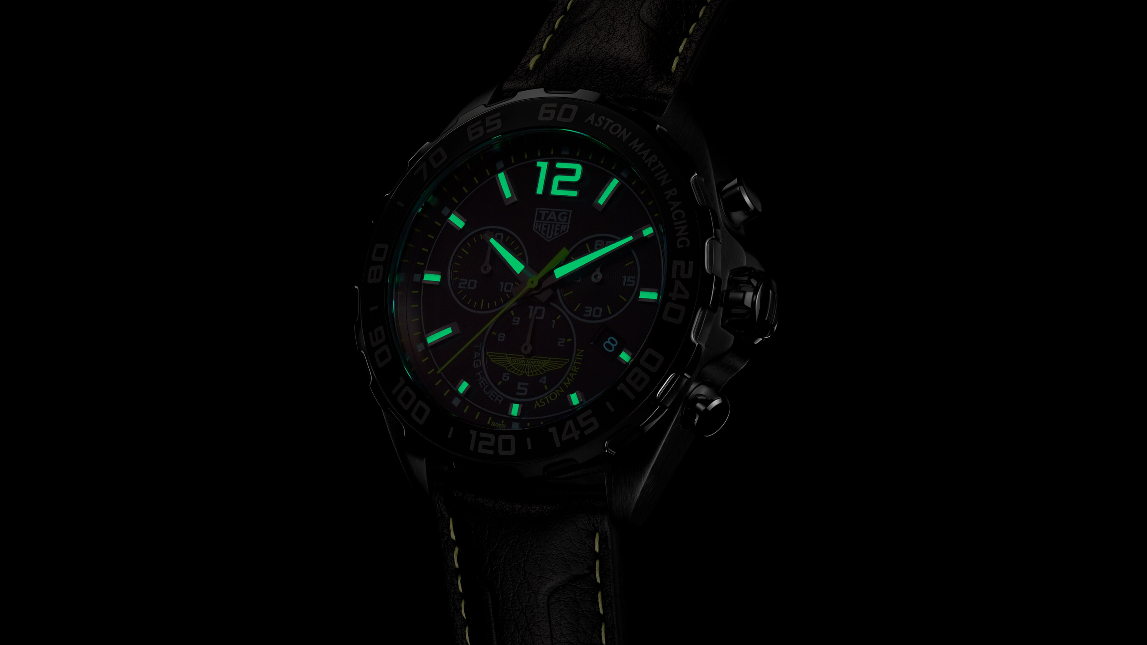 Gli indici, la lancetta dei secondi e il celebre logo alato Aston Martin sono declinati nel colore emblema del team, verde lime, e creano un forte contrasto con il quadrante total black. Il sontuoso cinturino in pelle nera presenta impunture nell’iconico verde lime del leggendario team da corsa.