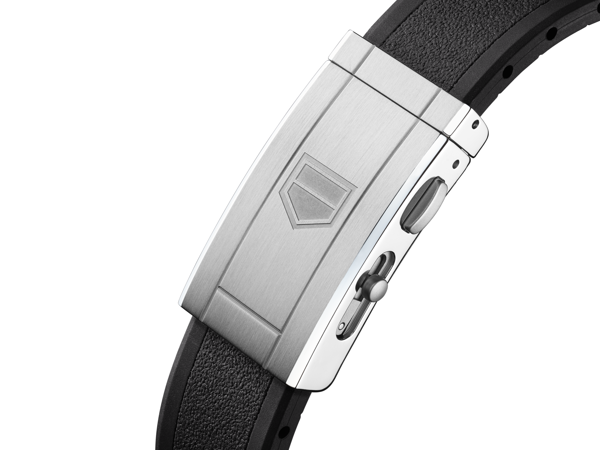 The resilient black rubber strap integrates a steel folding clasp with double safety push-buttons for absolute confidence in the most challenging odysseys.