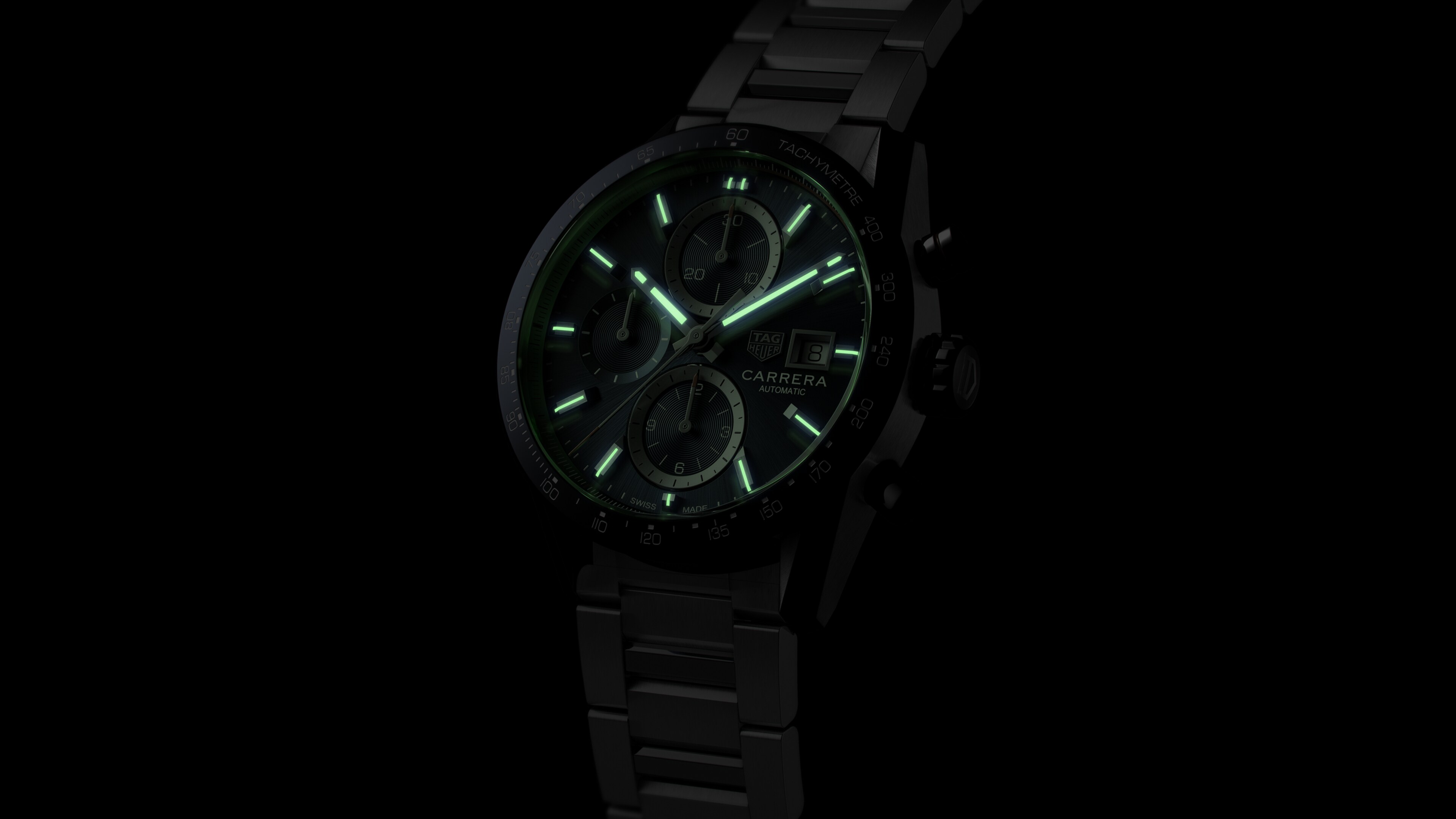 Stylish and versatile, the chronograph’s 41mm polished and brushed steel case Is water-resistant to 100 meters and protected by a sapphire crystal harder than steel.