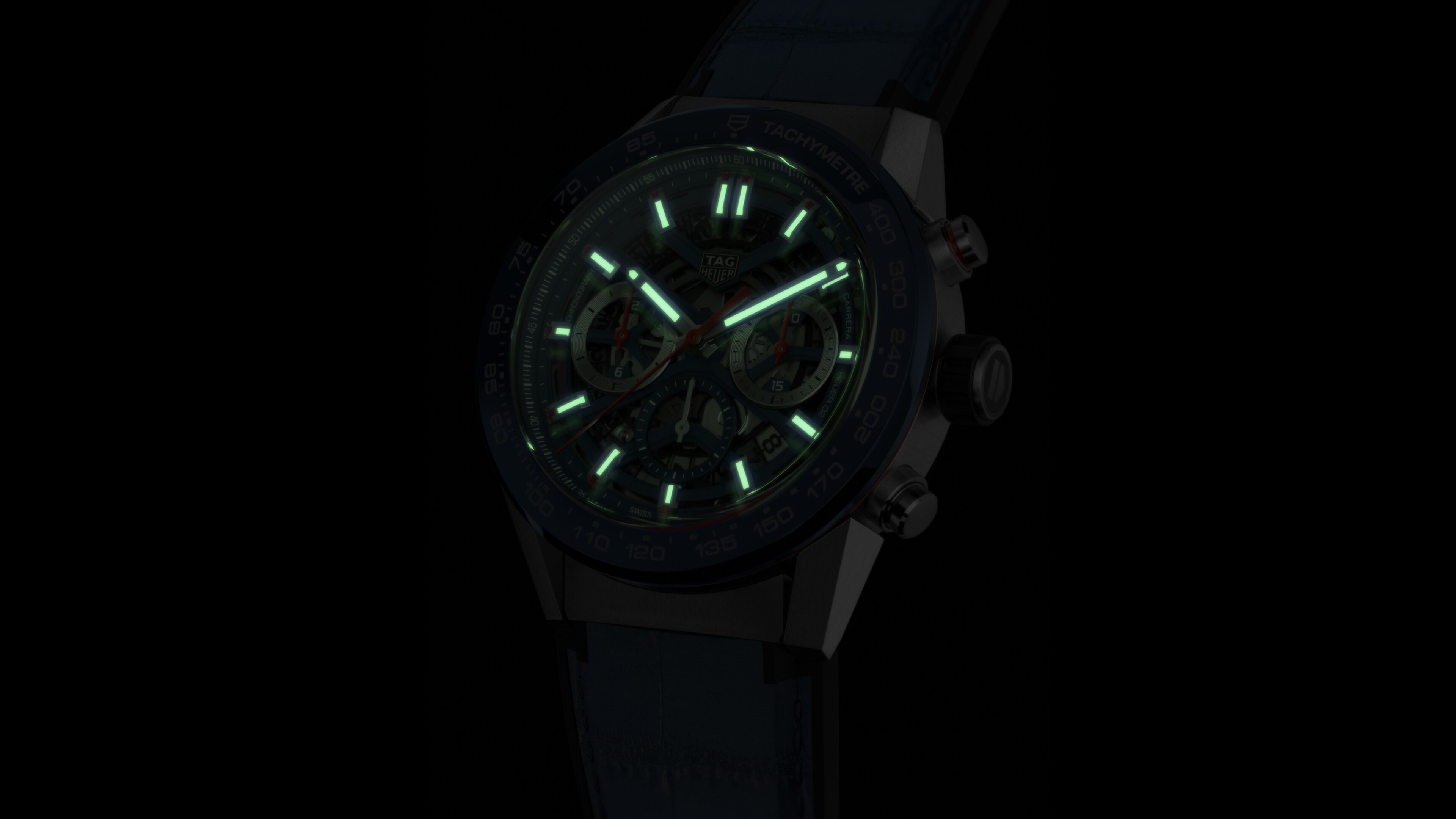 This TAG Heuer Carrera chronograph with blue skeleton dial in a larger, 45mm steel case. The collection’s unique motor-racing heritage is expressed by a strap in blue alligator with black rubber lining.