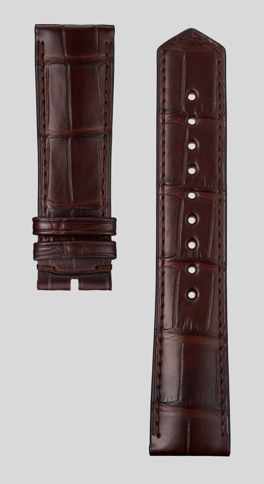 This distinctive, rich brown alligator leather strap adds a touch of sophistication to 42mm TAG Heuer Carrera models. Its black lining and tone-on-tone stitching quietly state luxury, embodying the TAG Heuer Carrera's enduring legacy.