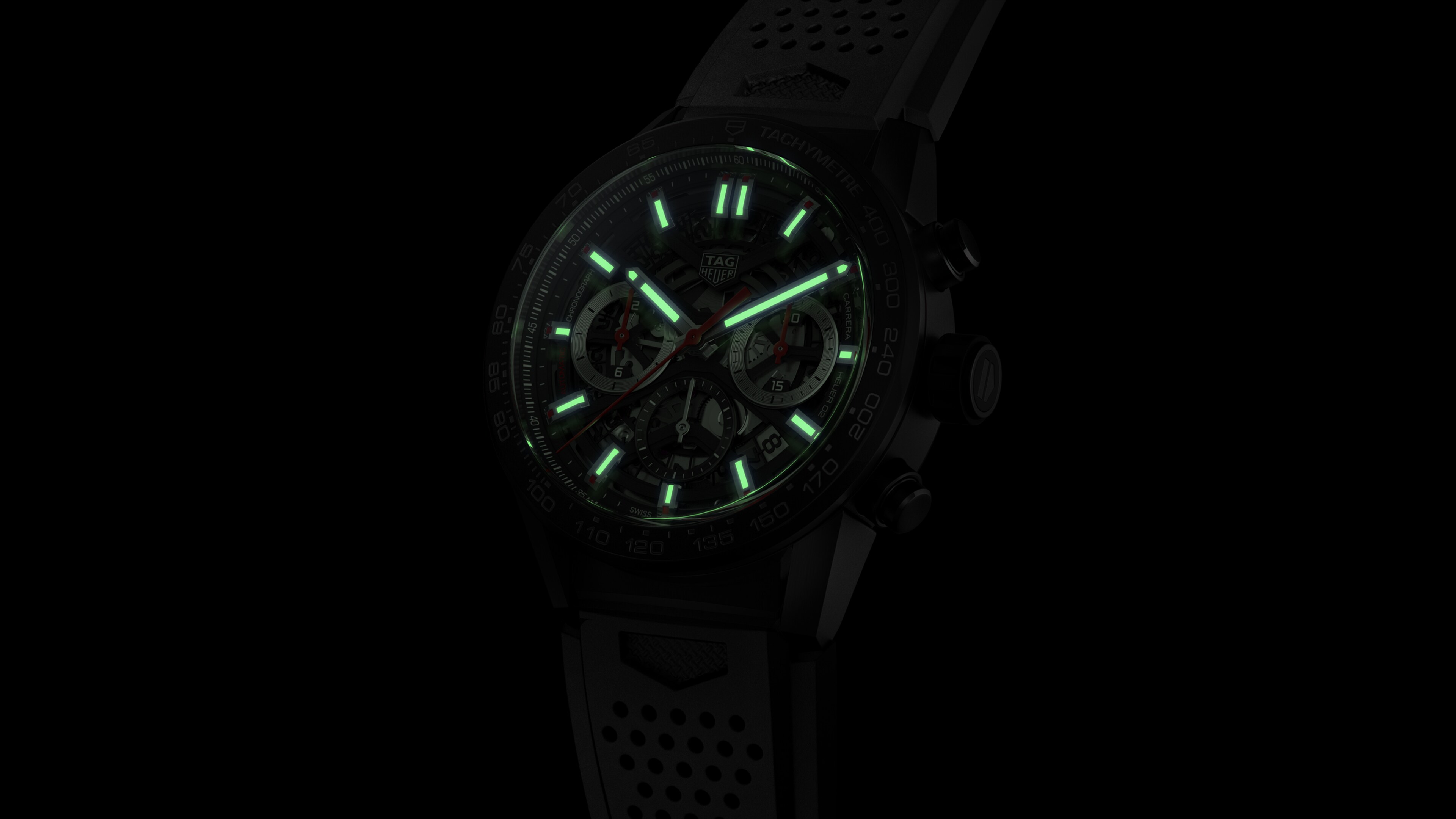Automatic, 43 mm, Ceramic CBG2090.FT6145A black ceramic tachymeter chronograph, equipped with the new Manufacture Heuer 02 automatic movement, who has a stunning 80 hours power reserve. The black skeleton dial is matched with a racing-inspired strap in perforated rubber.