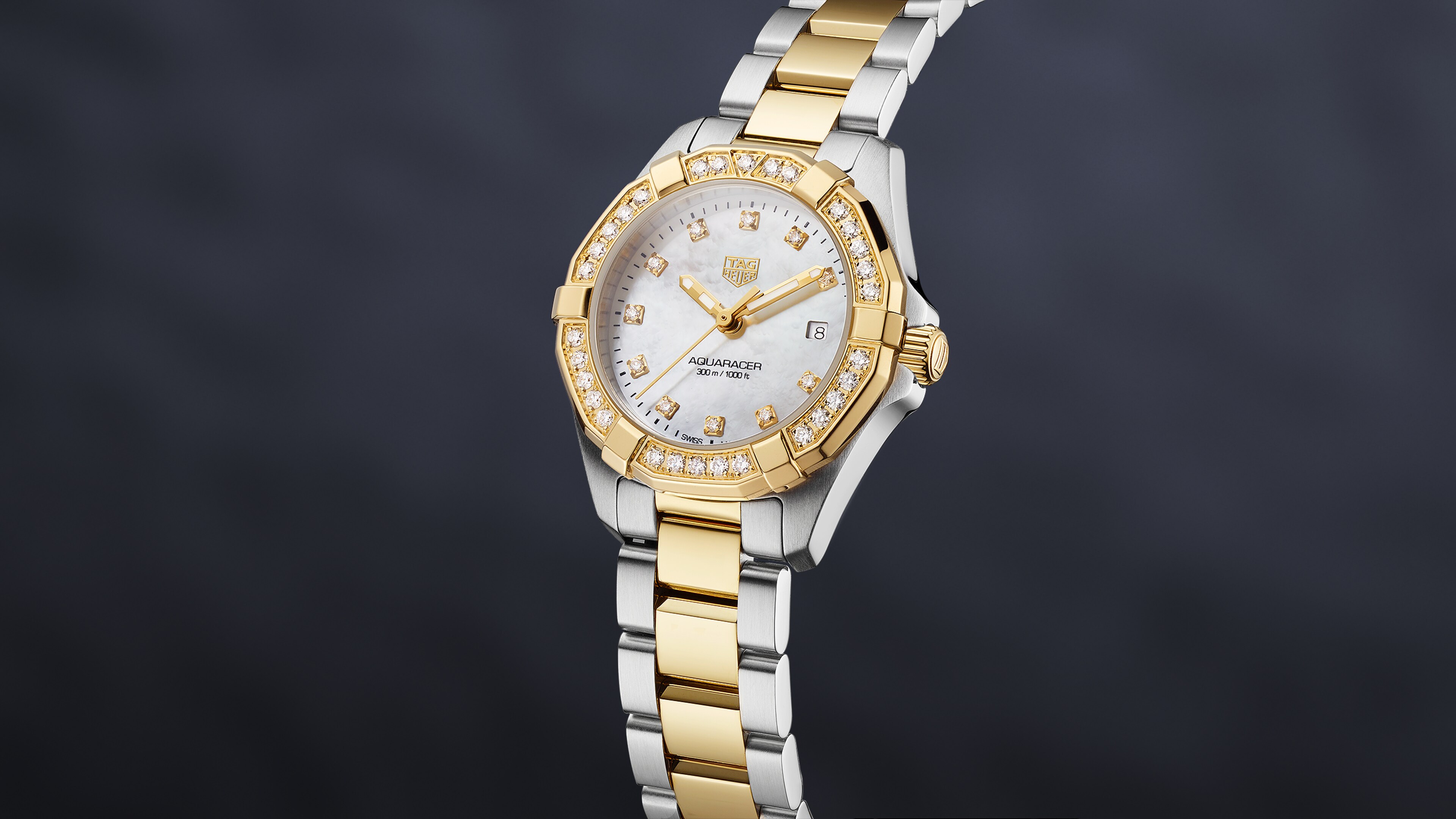 石英, 27 mm, 精钢 WBD1423.BB0321尺寸小巧(27毫米),点缀镀金(2N)与钻石细节(0.4358克拉),同时继承深厚的运动传统。防水深度达300米,表链配备潜水延展装置,夜光指针提升读时性能。