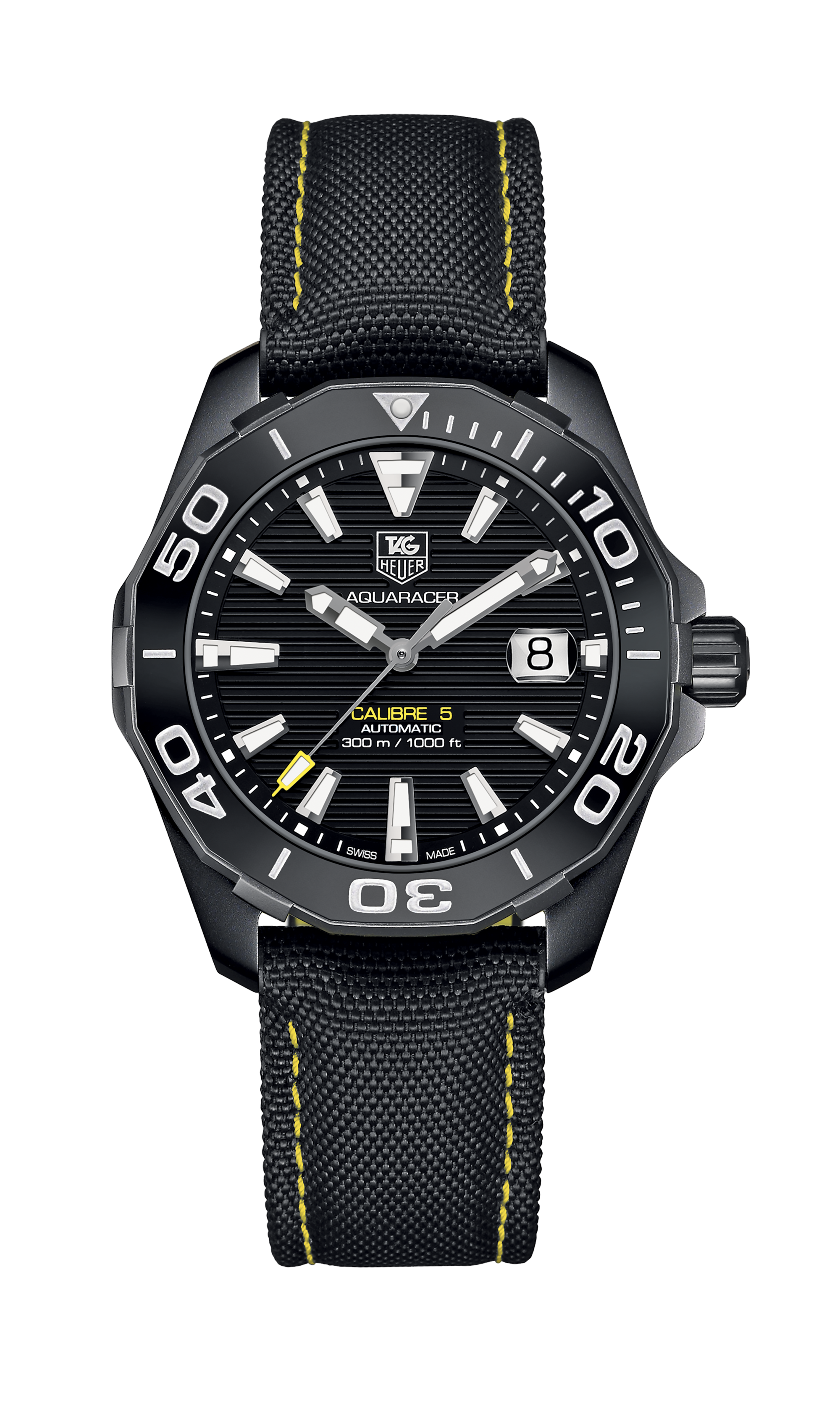 Swiss-made, this bold TAG Heuer Aquaracer is an aesthetic 41 mm watch. This model features a Steel case and a Calibre 5 Automatic movement.