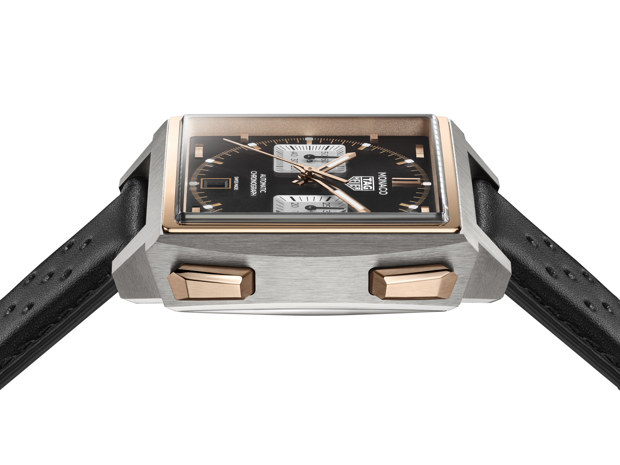 黑色蛋白石质感饰面表盘设有银色小表盘,搭配镀18K 5N玫瑰金时标和指针,涂覆白色Super-LumiNova®荧光涂层,确保清晰读时。6点钟位置设有日历视窗,为表盘增添均衡之感,点缀精妙的金色细节,彰显泰格豪雅摩纳哥系列标志性的方形几何美学。