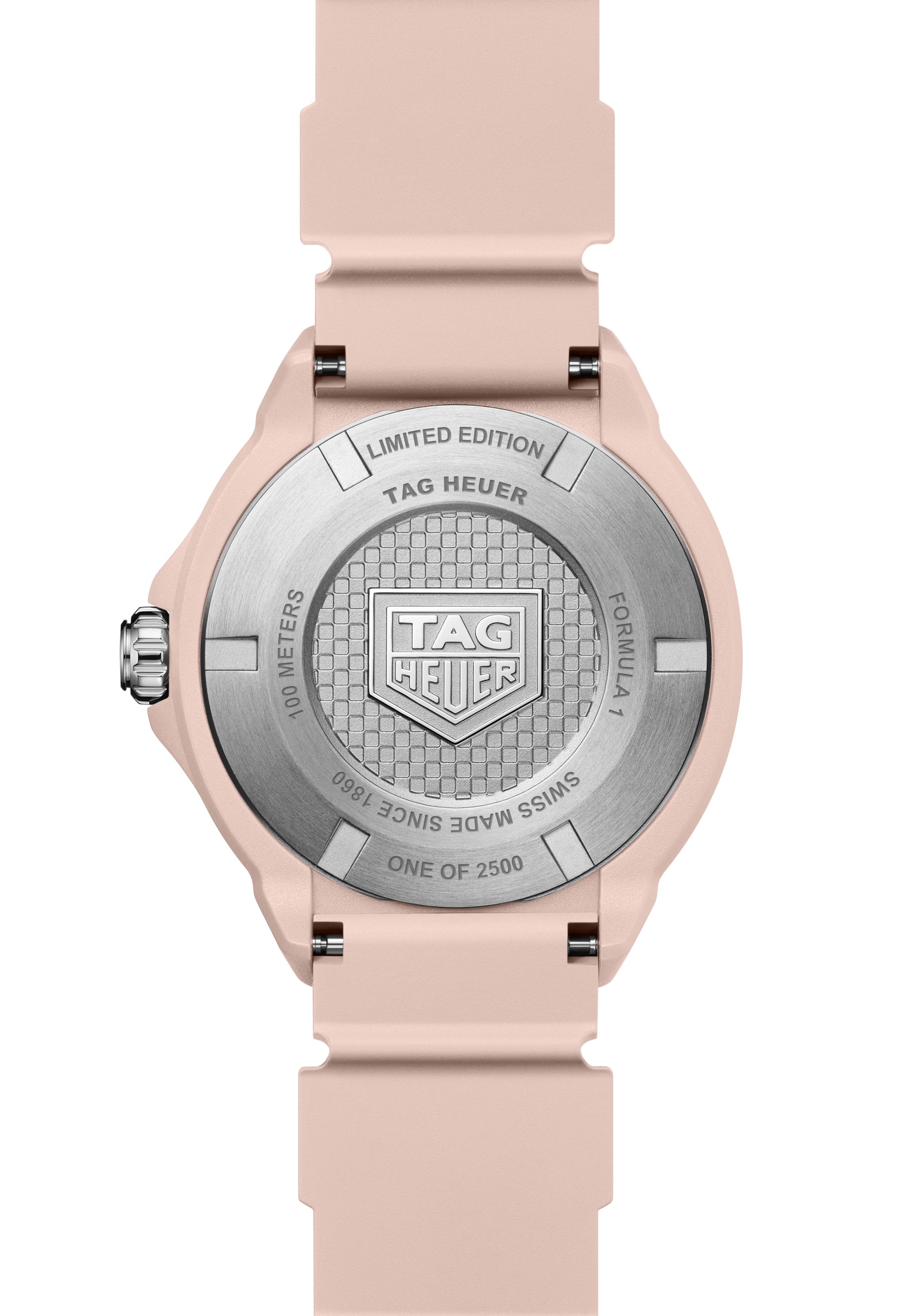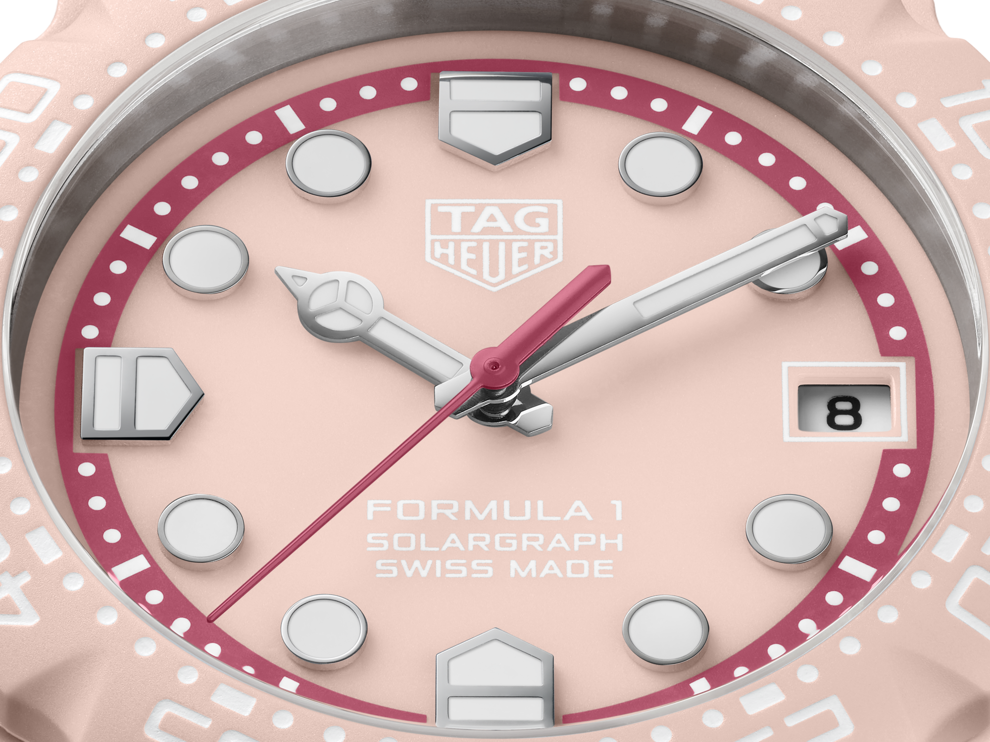 這款TAG Heuer Formula 1(F1)Solargraph限量版腕錶兼具大膽設計與輕盈結構。腕錶搭載創新的TH-Polylight錶殼,佩戴舒適且堅固耐用。淡粉色錶面搭配鍍銠刻度和品牌標誌性盾形時標,確保清晰讀時。採用TH-Polylight打造的雙向旋轉錶圈進一步彰顯了該系列對實用設計的不懈追求。腕錶搭載Solargraph Calibre TH50-00機芯,能夠將光能轉化為動能,確保計時可靠精準,動力持久充沛,且幾乎無需特別維護。