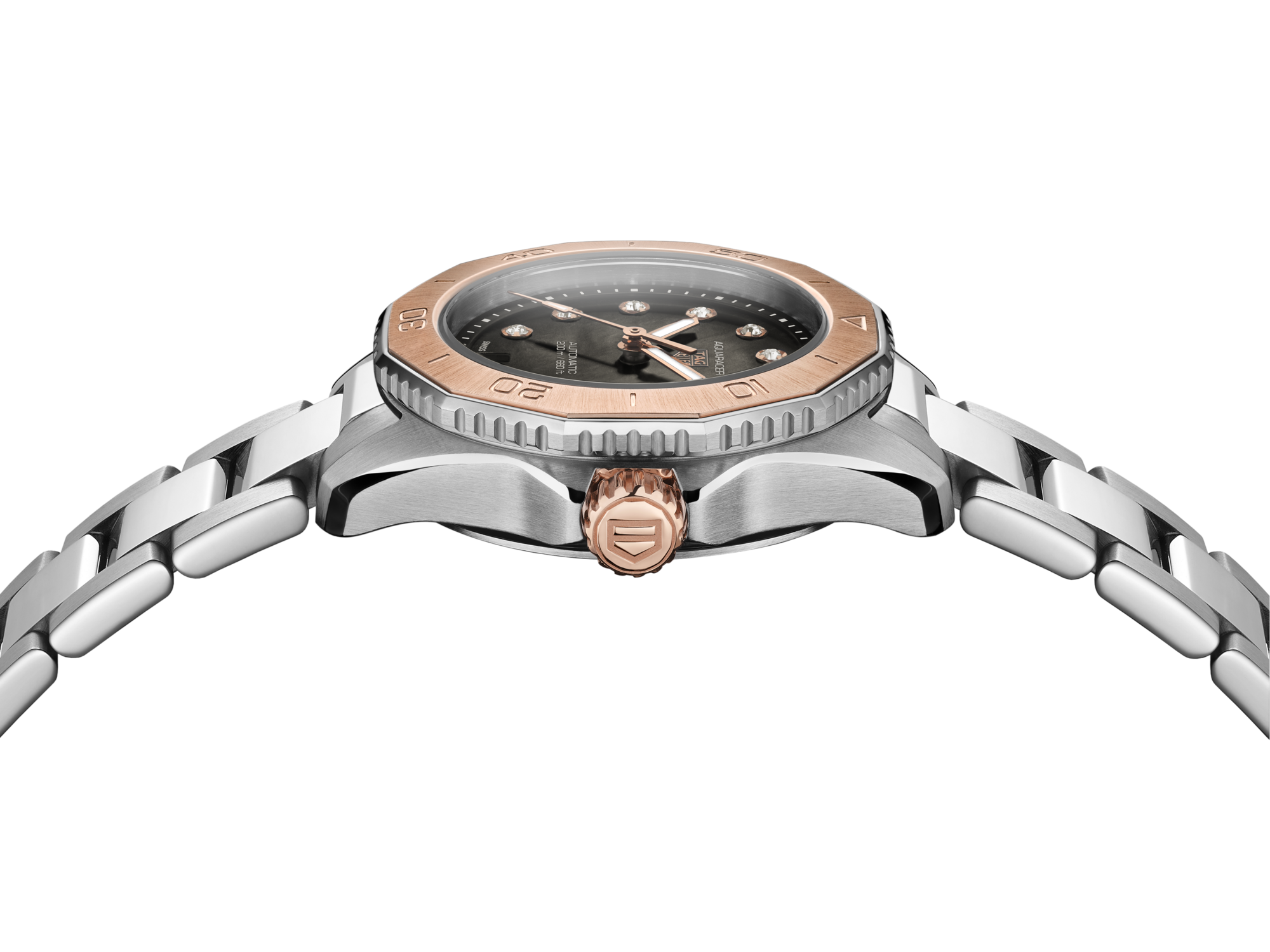 Elegance defines this TAG Heuer Aquaracer timepiece, showcasing the refined beauty of 18K 5N rose gold touches and the brilliance of shimmering diamonds. With its captivating smokey black mother-of-pearl dial and sleek stainless steel bracelet, this timepiece is ready to explore new horizons.