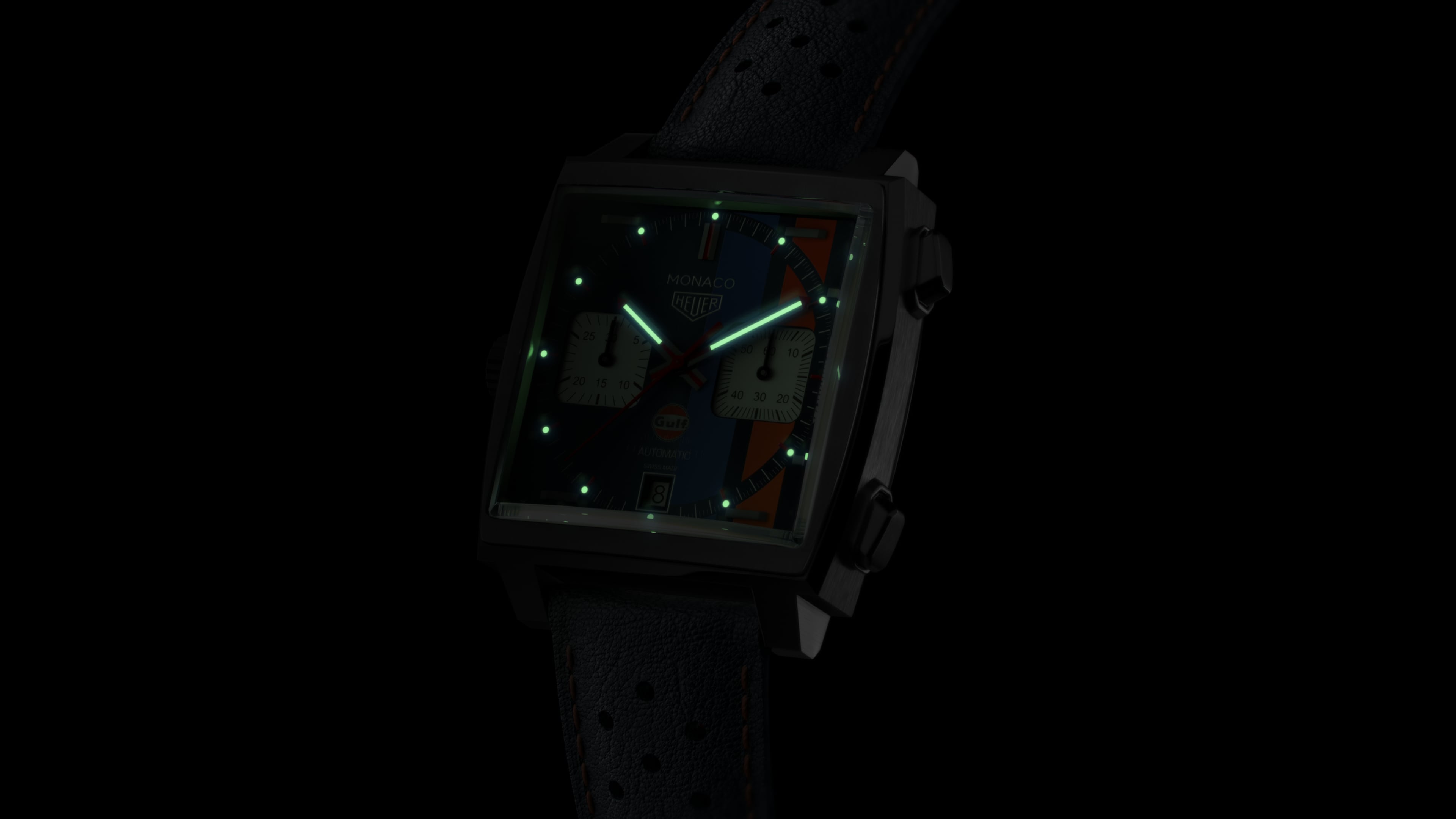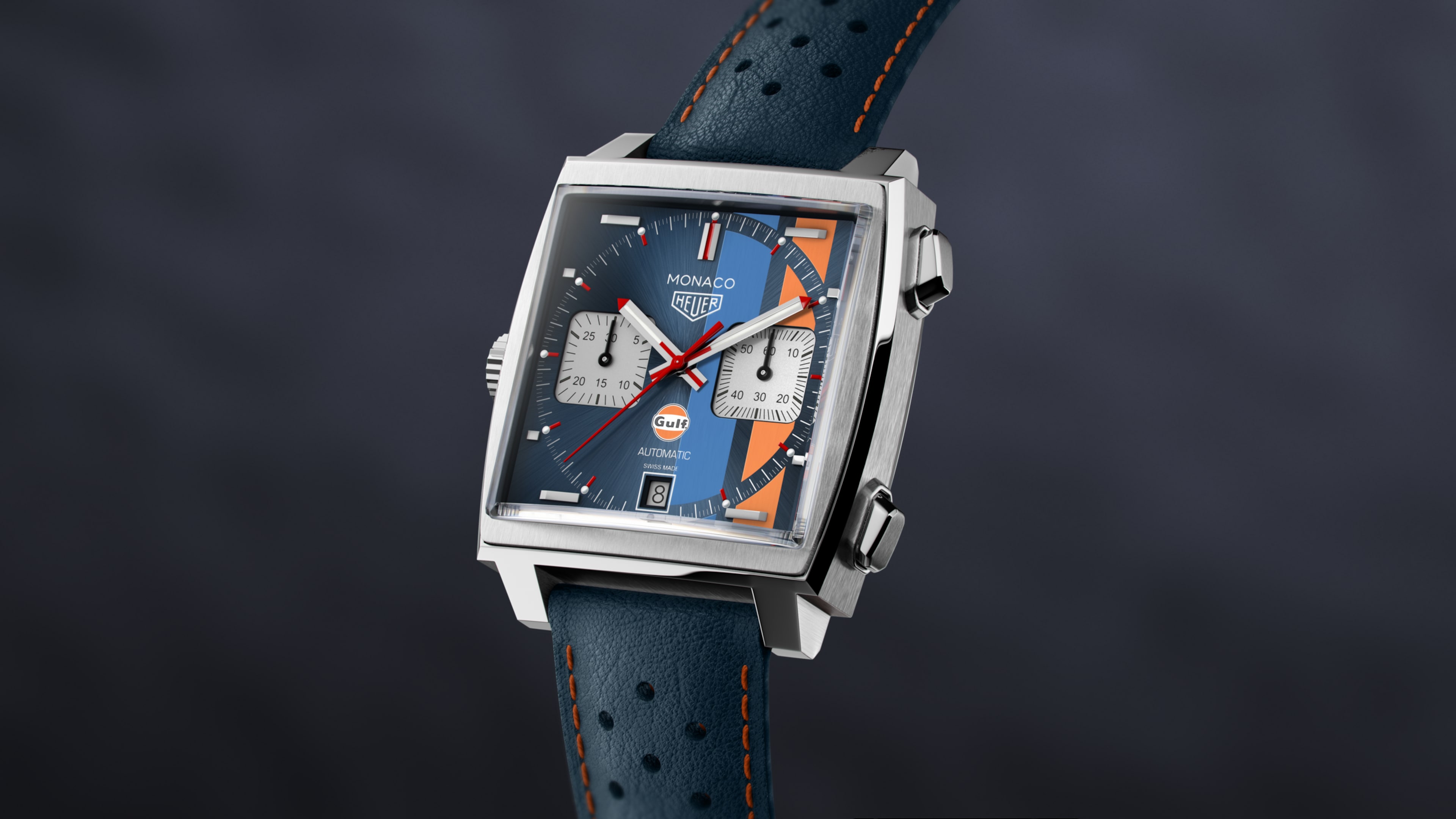 The piece is completed by a perforated blue leather strap with orange lining and topstitching—another stylish nod to the Gulf legacy, and “King of Cool” Steve McQueen’s robust blue and orange sports car.