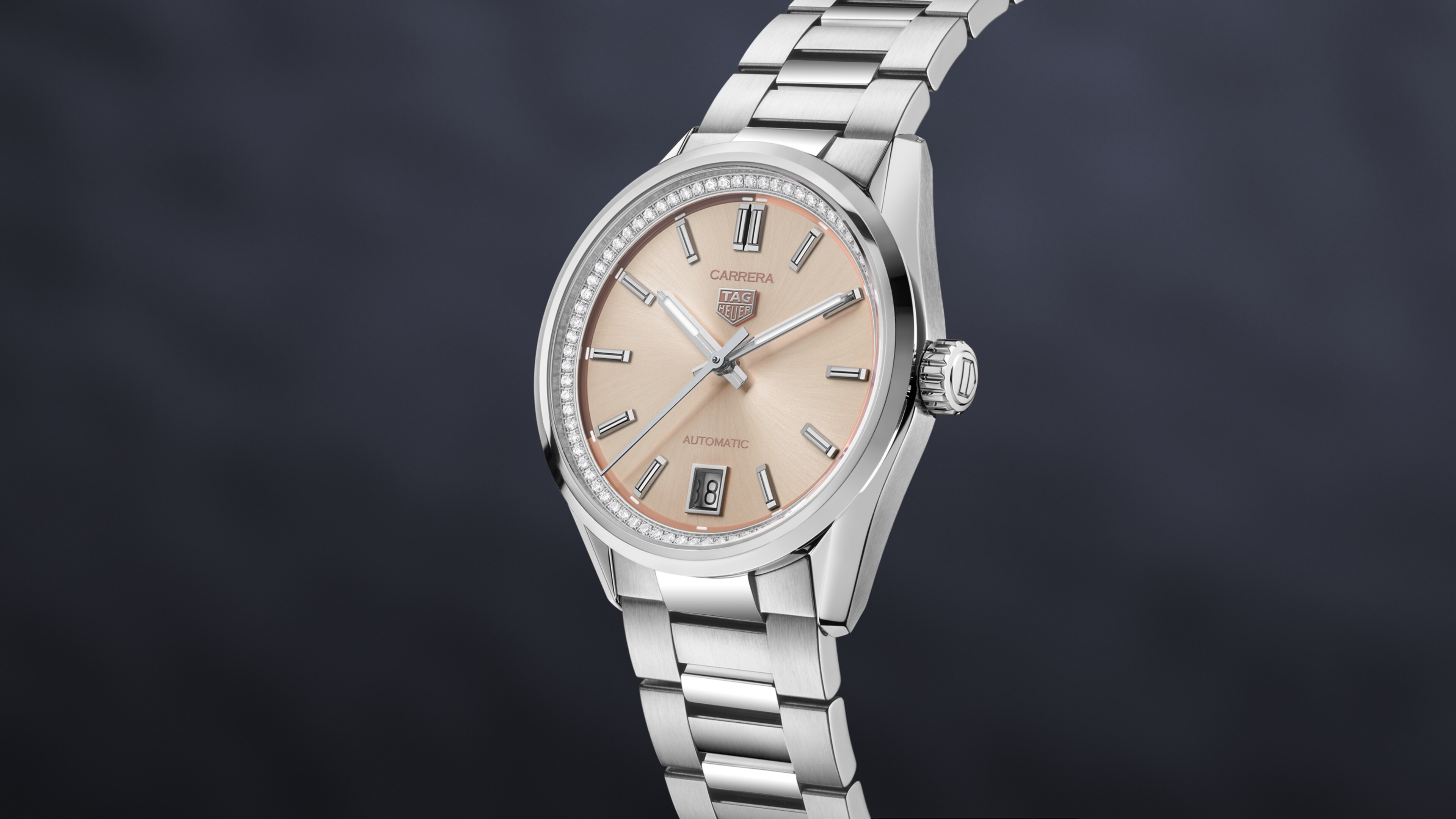 Caratterizzato da finiture di lusso, il quadrante a spirale color pesca presenta una sfumatura abbinata e un logo TAG Heuer rodiato applicato. La quintessenza dell'eleganza.