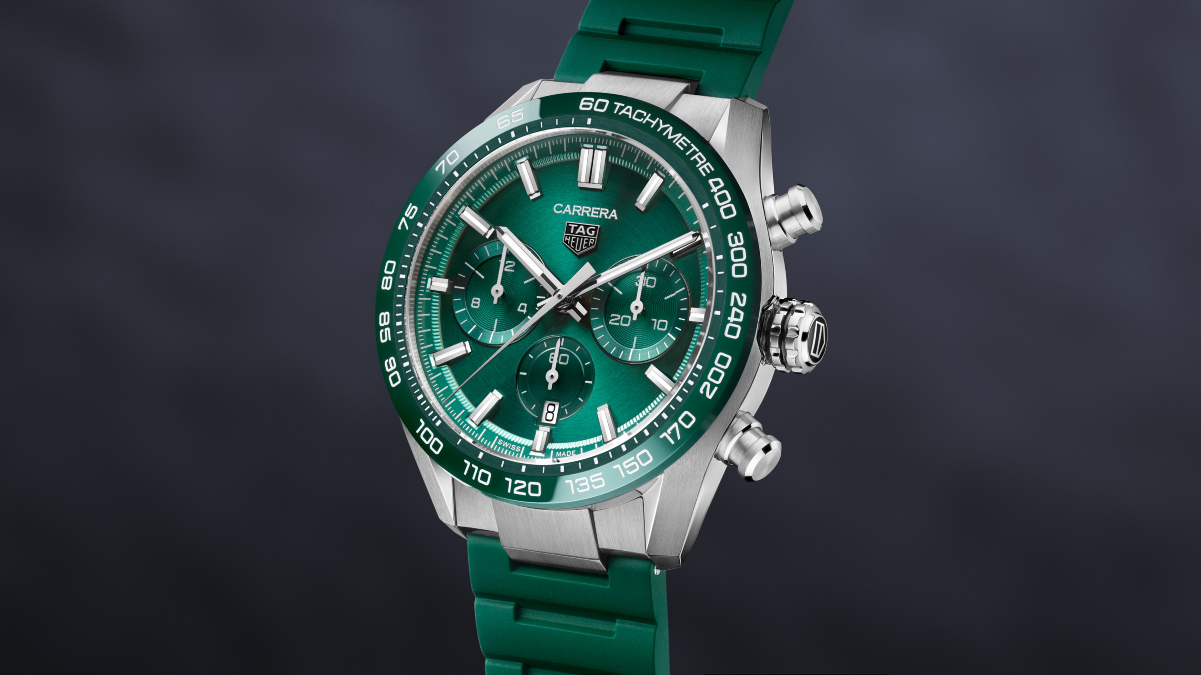 Il quadrante verde con spazzolatura circolare si abbina alla lunetta con scala tachimetrica in ceramica tono su tono e al cinturino in caucciù verde per un effetto straordinario.