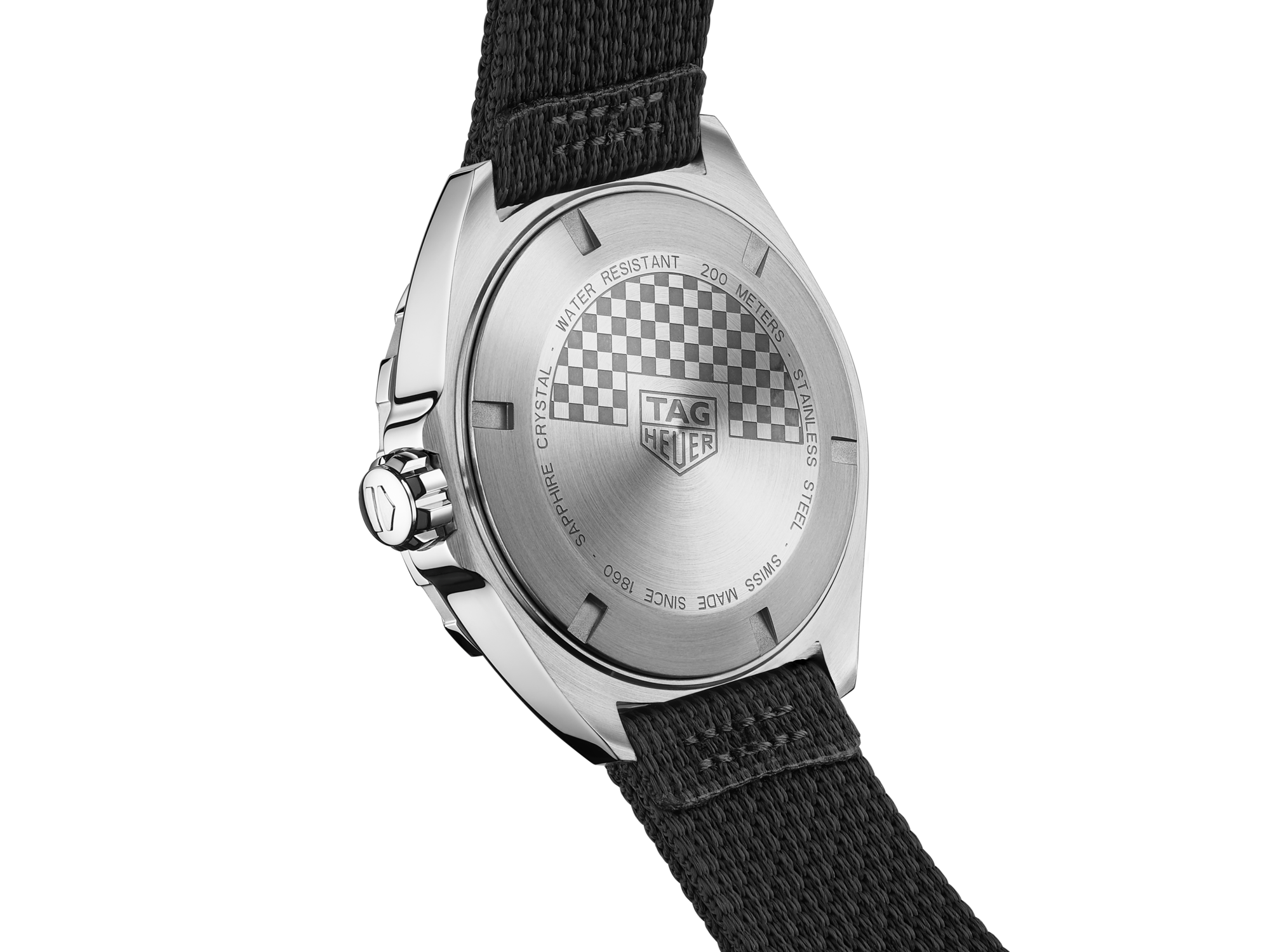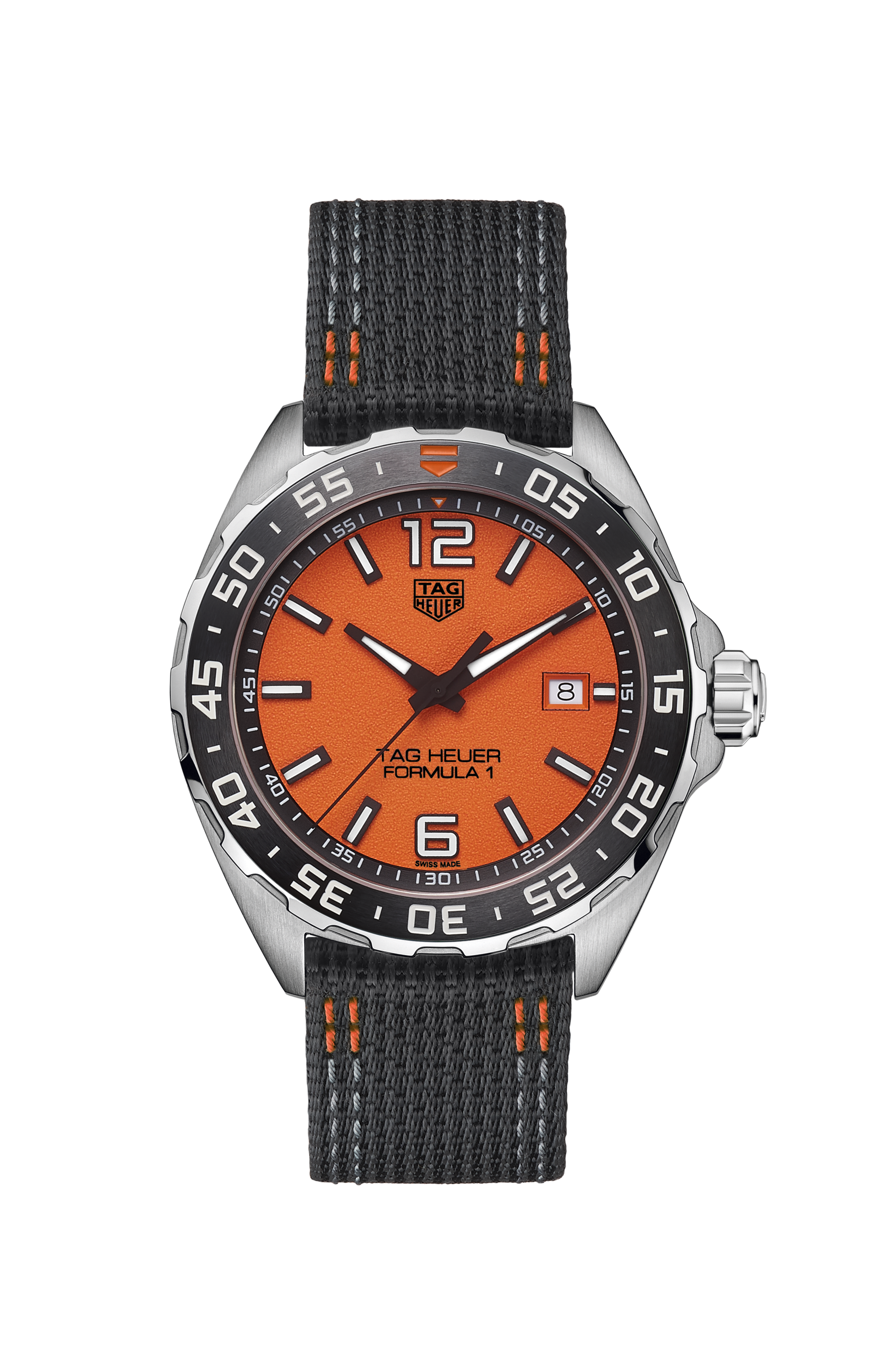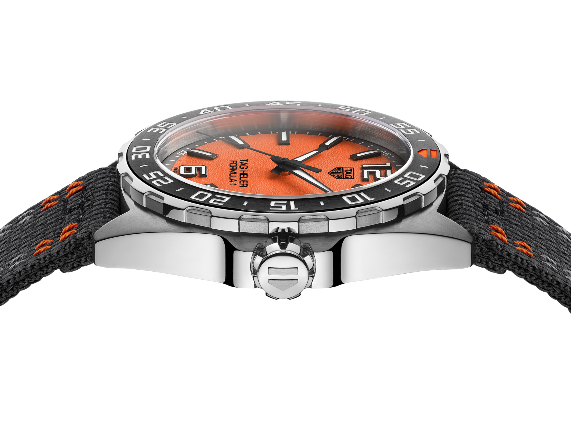 Ce modèle de 43mm à 3 aiguilles affiche un cadran texturé orange vif accentué de blanc. Le bracelet en nylon noir dévoile des touches d'orange et de gris, en hommage aux TAG Heuer Formula 1 des années 80 et 90.