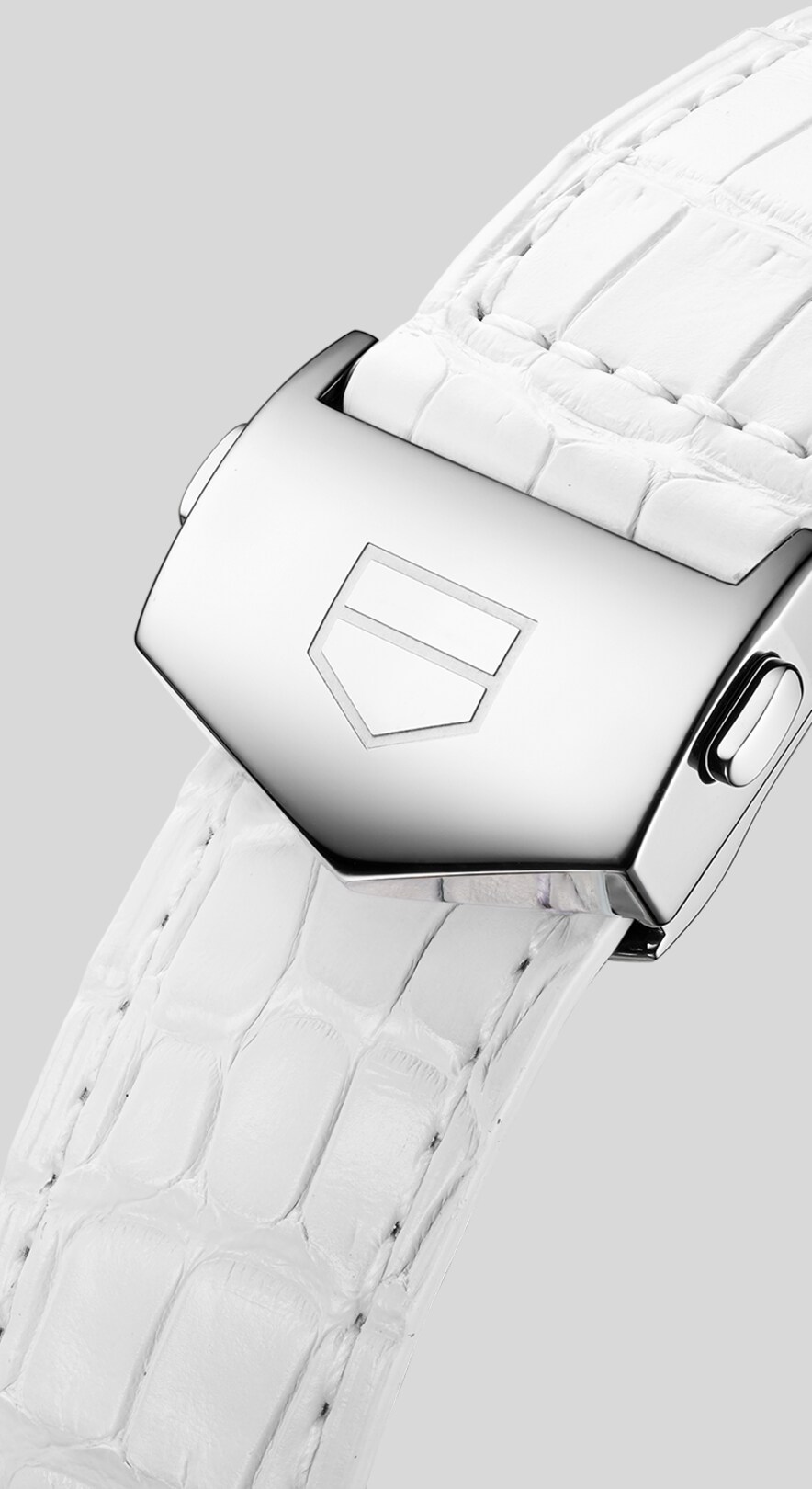Le logo TAG Heuer contraste avec le cadran blanc. Les index et aiguilles appliqués de Super-LumiNova® blanc renforcent l'élégance de l’éclat ; tout comme le second compteur permanent en nacre blanche à 6 heures et sa pointe de rouge.