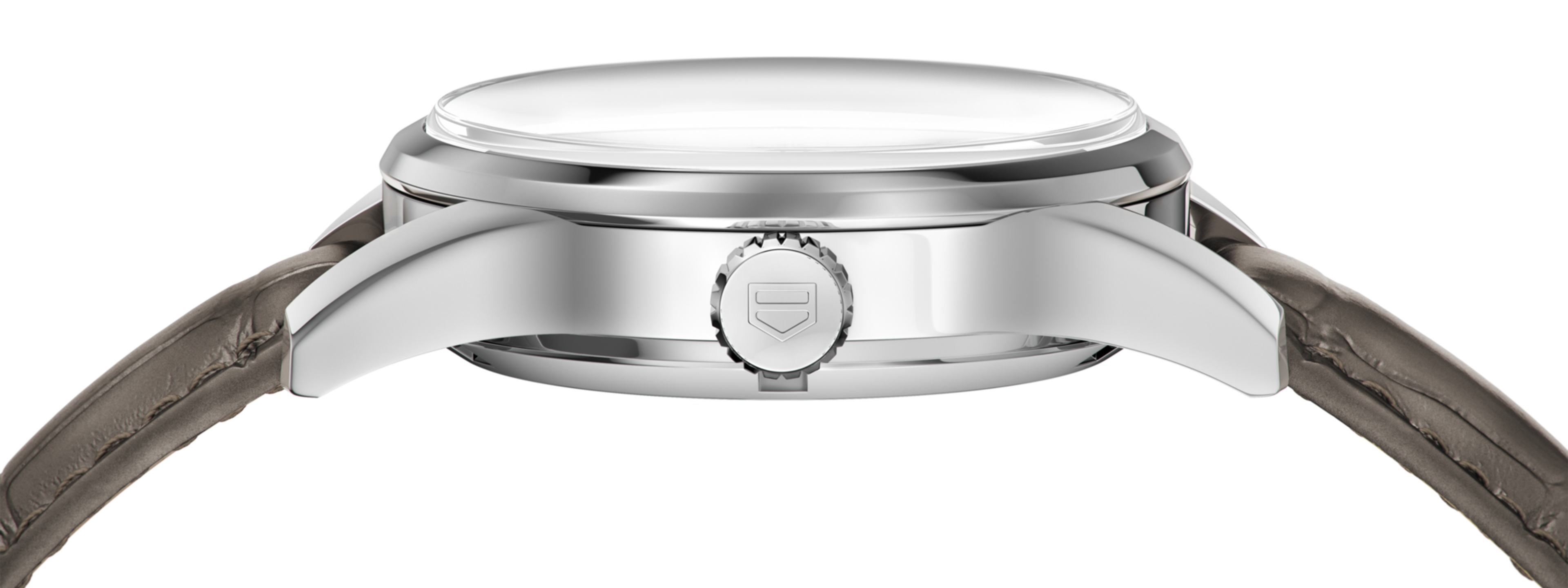 The elegant strap of this TAG Heuer Carrera Lady is gray alligator, with gray stitched.