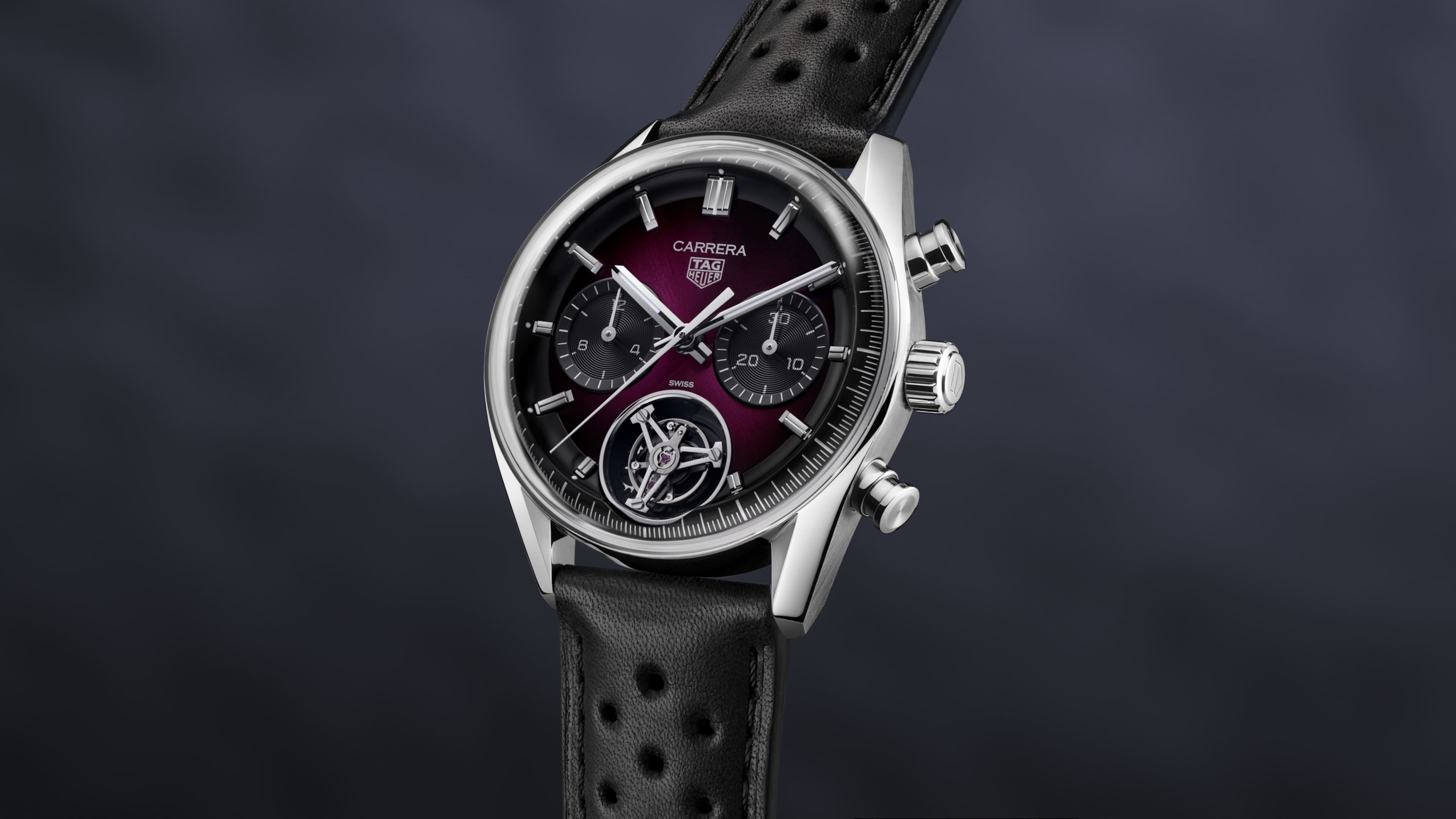 Automatic, 42 mm, Steel CBS5017.FC6605The TAG Heuer Carrera Chronograph Tourbillon combines precision and elegance with a bold new color. Featuring a smokey purple sunray brushed dial and our in-house Heuer 02 (TH20-09) tourbillon movement, this strictly limited edition of only 200 pieces offers unrivaled sophistication for the modern watch connoisseur.