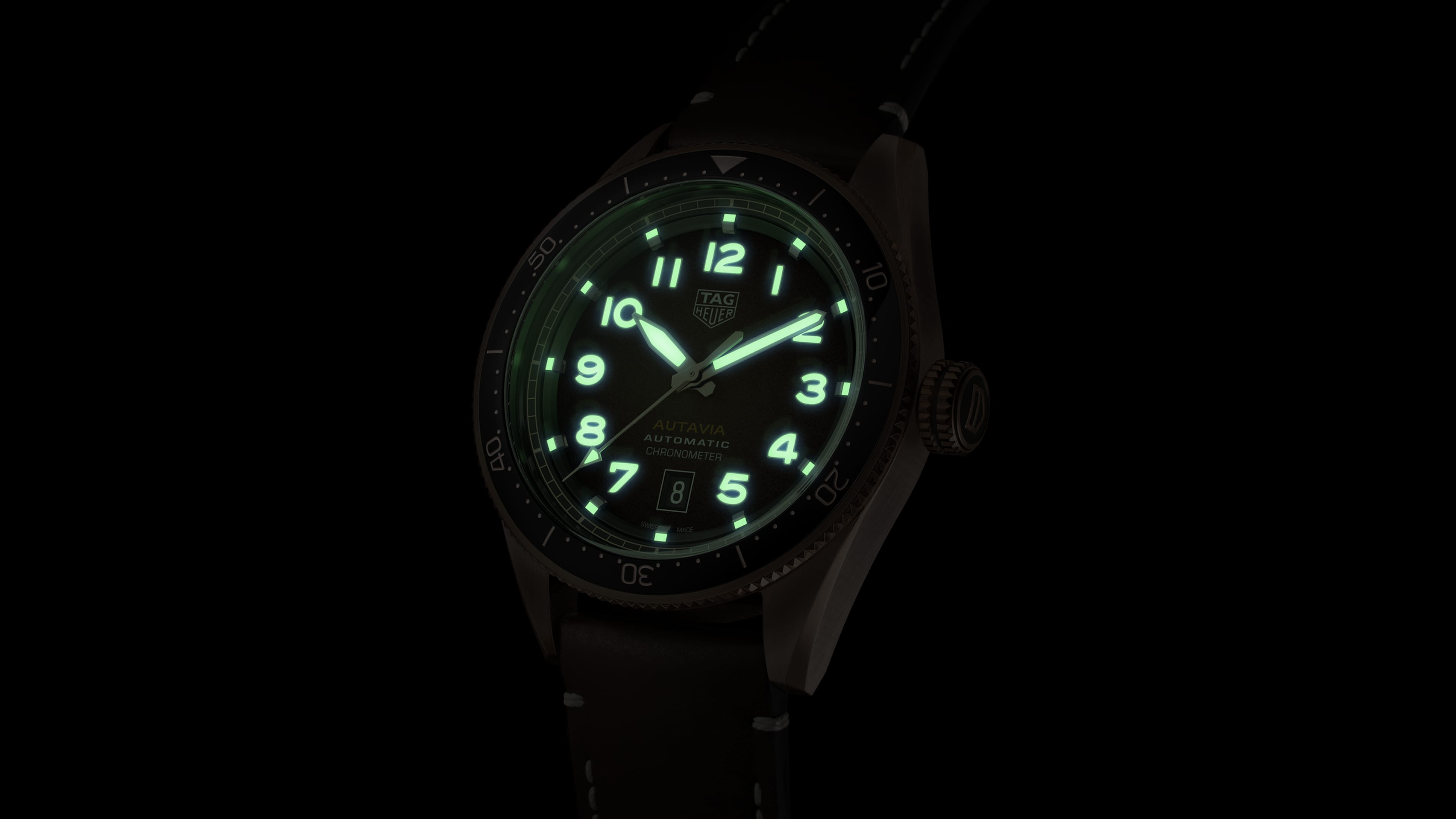 El despejado diseño de la esfera destaca aún más gracias al tratamiento con Super-LumiNova© color marfil de los números y agujas en forma de espada, aplicado para favorecer la legibilidad en condiciones de escasa luz. La vistosa ventanilla de calendario está situada a las 6.