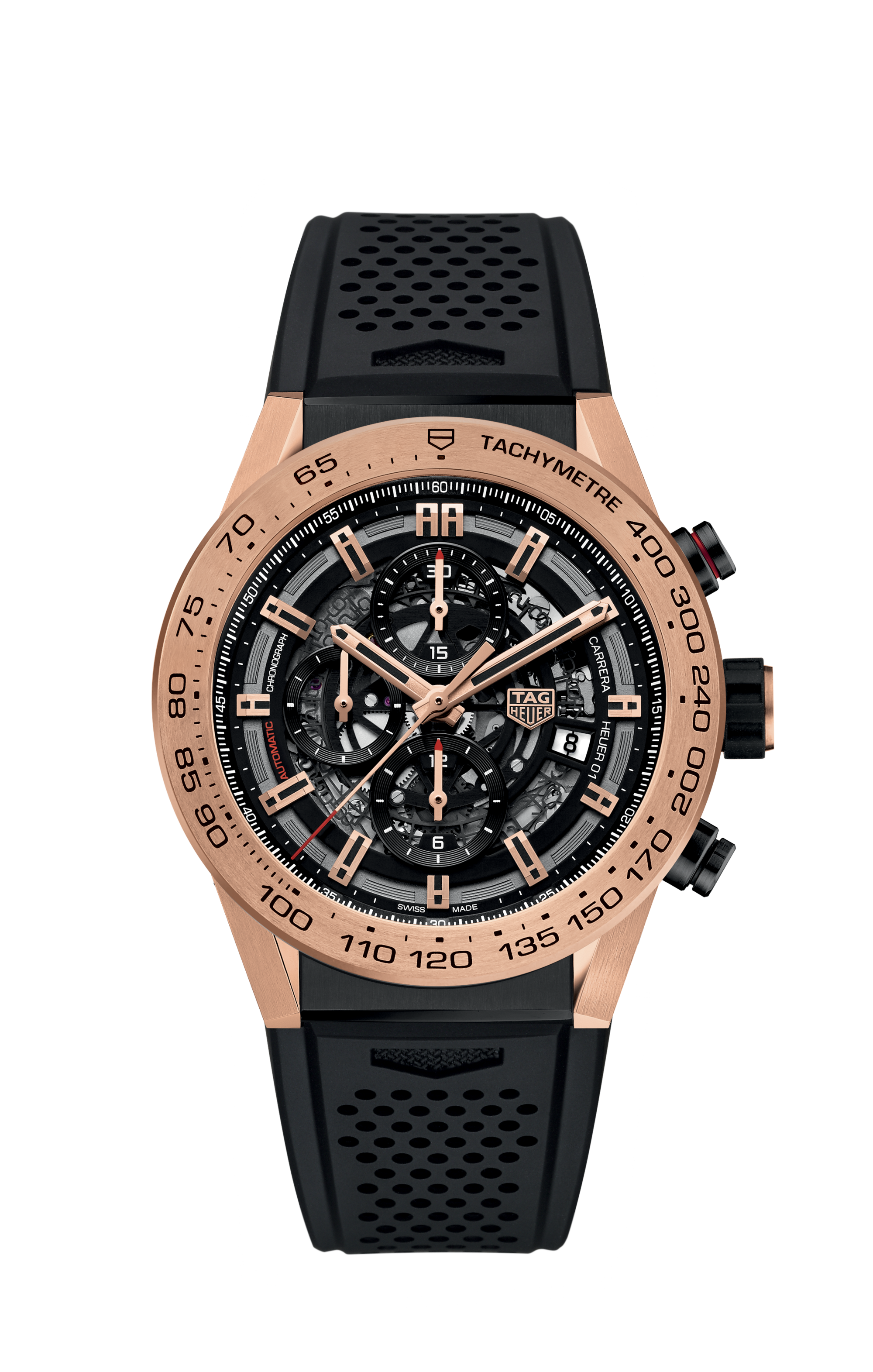 Swiss-made, this bold TAG Heuer Carrera is an aesthetic 45 mm watch. This model features a Titanium and Gold case and a Calibre Heuer 01 Automatic movement.