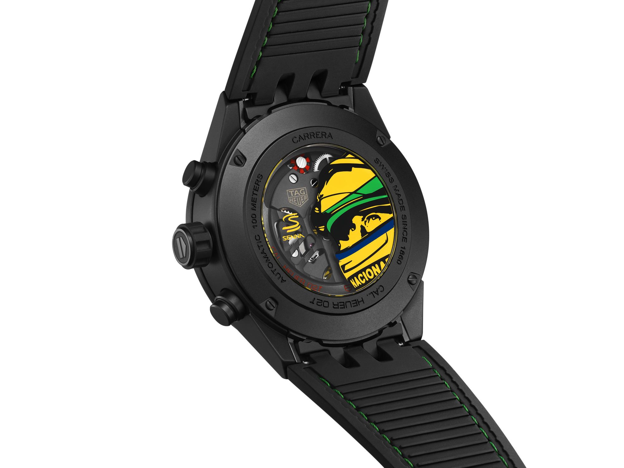 El emblemático casco de Senna está grabado en el fondo de la caja de zafiro, a través del cual se puede ver el movimiento automático de Manufactura Heuer 02T, que cuenta con la certificación COSC. El reloj hace gala de la destacada complicación del cronógrafo, un tourbillon volante de un minuto, mostrándolo a las 6.