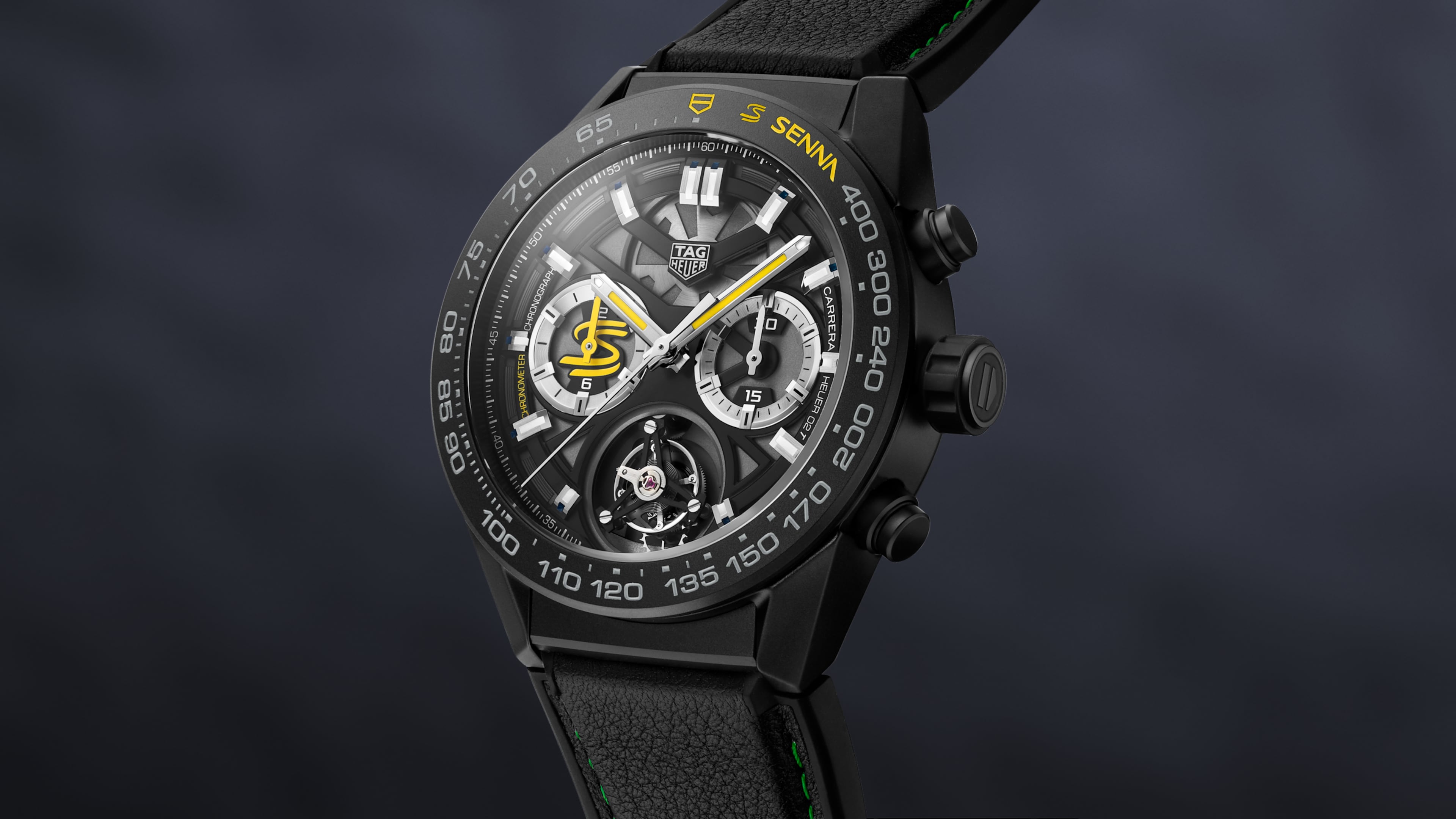 Automático, 45 mm, Cerámica CAR5A99.FT6174Una edición especial que celebra la colaboración de TAG Heuer con el legendario campeón del mundo Ayrton Senna. La esfera esqueleto plateada y negra presenta unos pespuntes amarillos y verdes sobre el caucho negro que rinden homenaje al país natal del piloto. El reloj lleva la inscripción "SENNA" sobre el bisel fijo de cerámica negra con taquímetro y una letra "S" amarilla (de Senna) en el contador del cronógrafo.