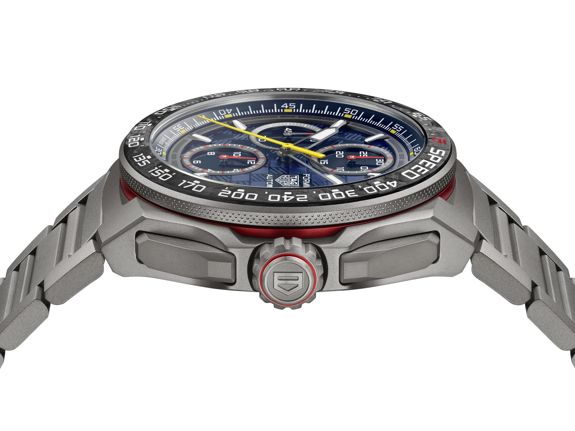 Este cronógrafo de 44 mm, diseñado en titanio grado 2 arenado y equipado con el movimiento automático Calibre 16, cuenta con un bisel fijo con escala taquimétrica de carbono gris y negro para proporcionar una estanqueidad de 200 metros.
