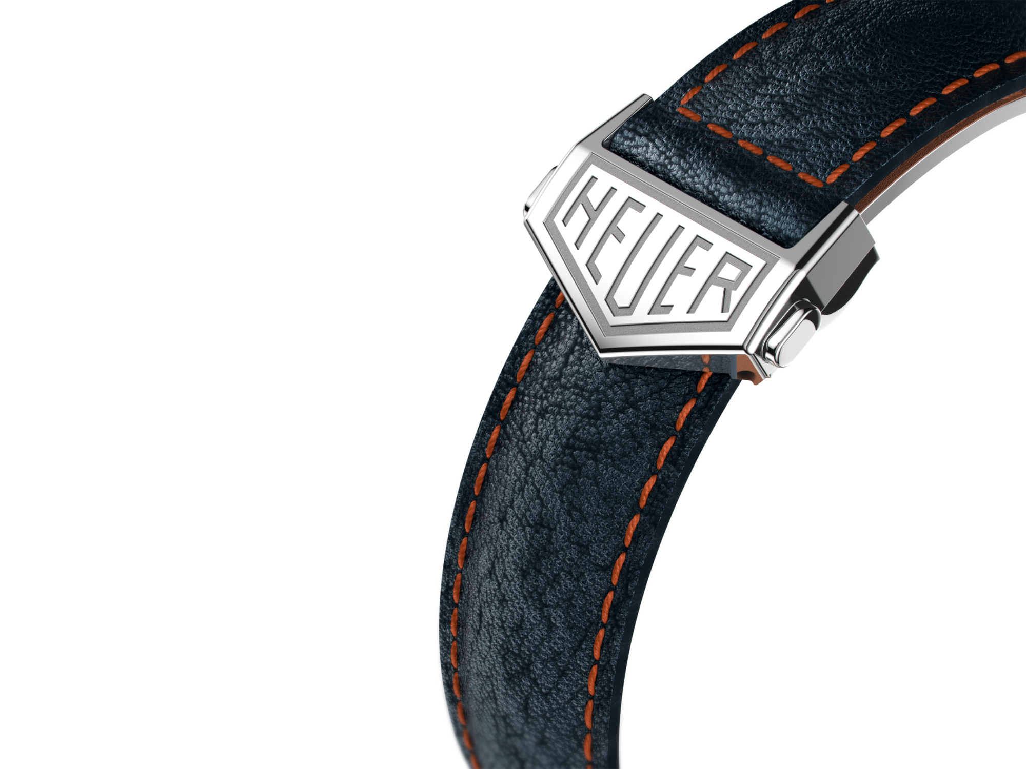 La pieza se completa con una correa de piel azul perforada con pespuntes y forro naranja, otro elegante guiño al legado de Gulf y el robusto deportivo azul y naranja de Steve McQueen, el "King of Cool".