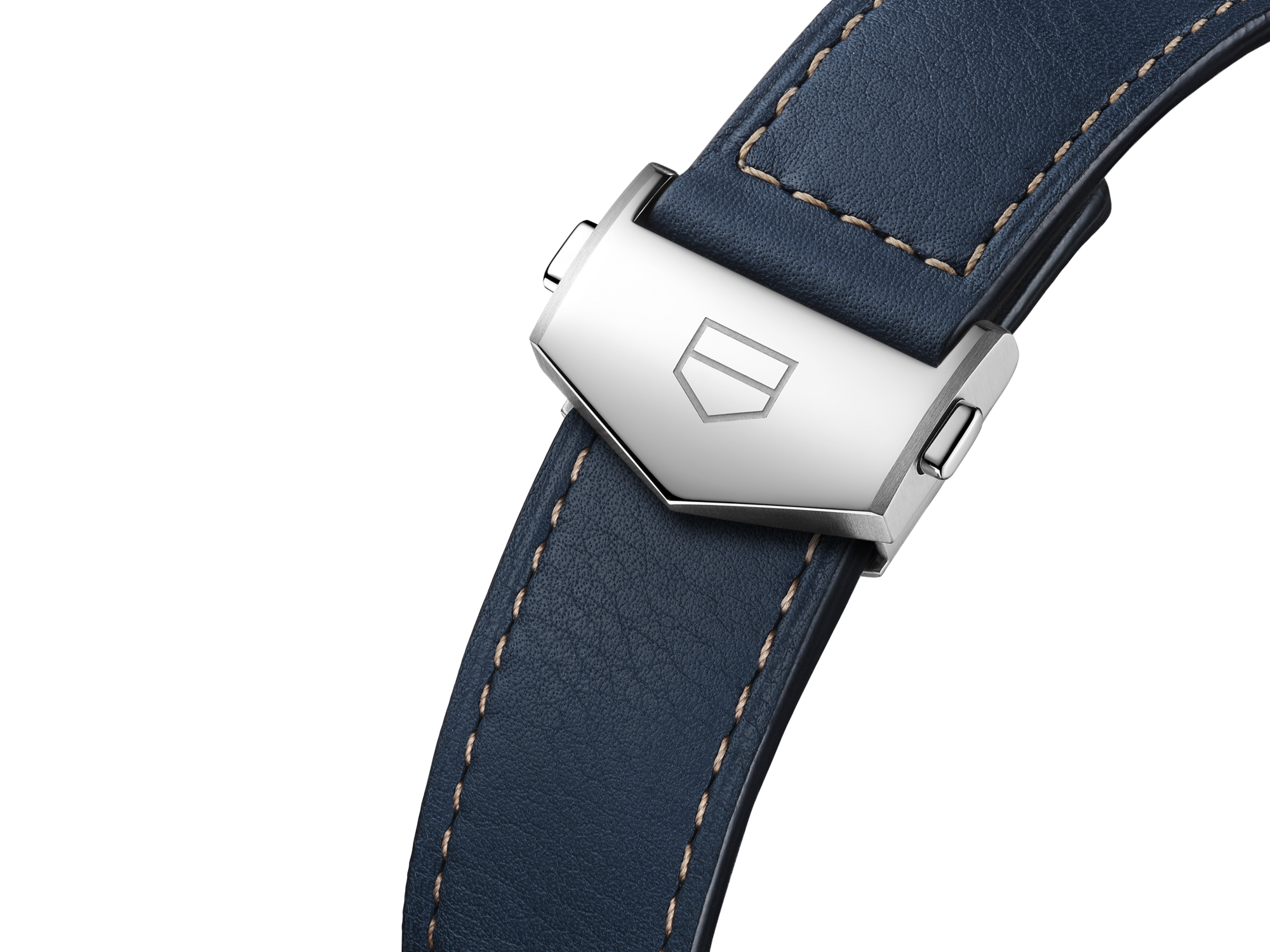 Crafted out of blue calfskin leather, the bracelet shows a rose gold color stitching and an applied TAG Heuer logo. The steel folding clasp with double safety push buttons brings extra confidence on the go.