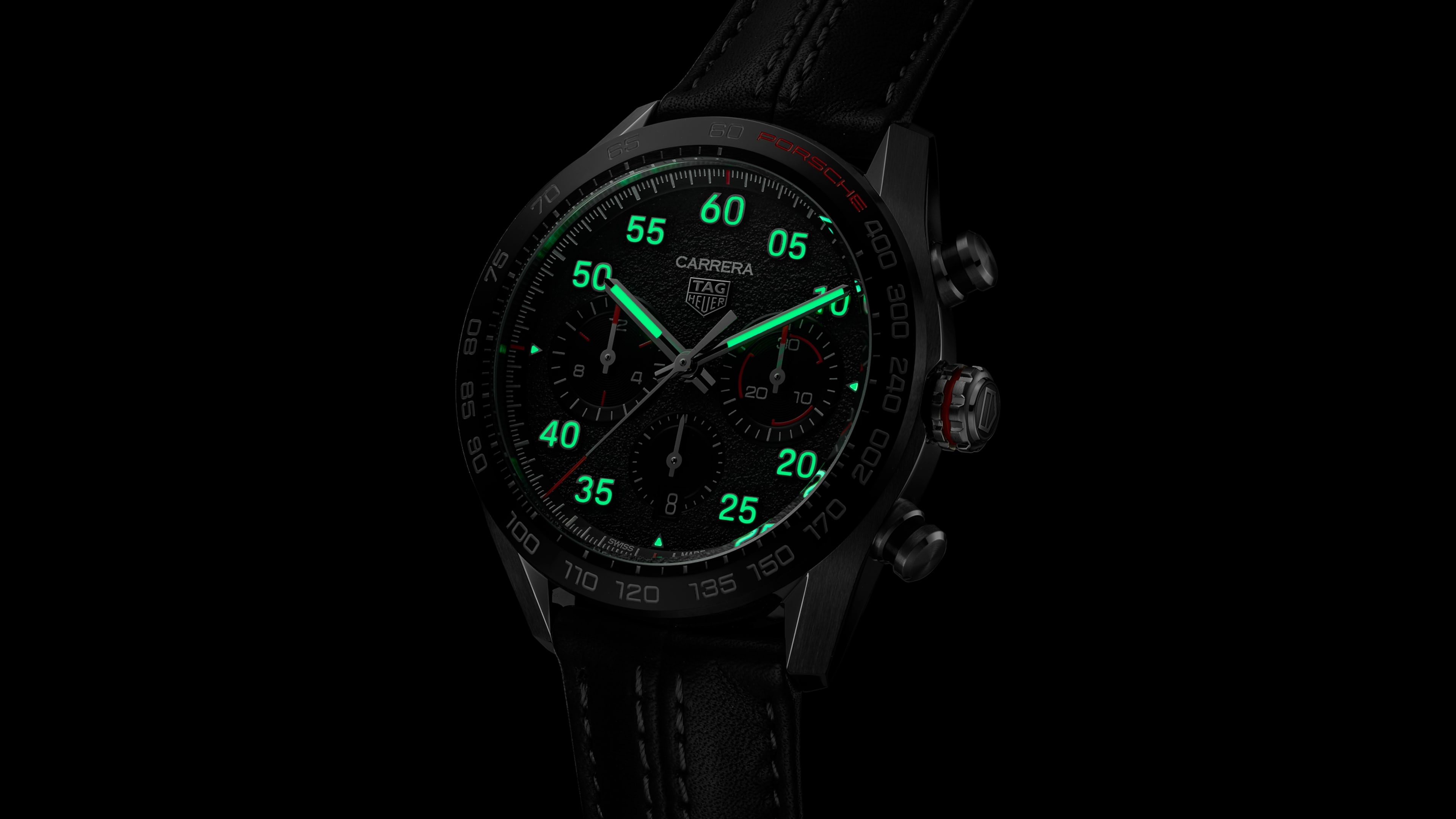 The TAG Heuer Carrera Porsche Chronograph is presented, with its 44mm case, on a soft strap in luxurious calf leather and innovative stitching that echoes the Porsche interior.