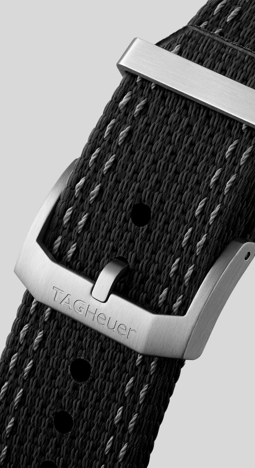 Matching the dial and bezel a high quality textile strap with eye-catching lime yellow accents, secured by a pin buckle for comfort on the race track.