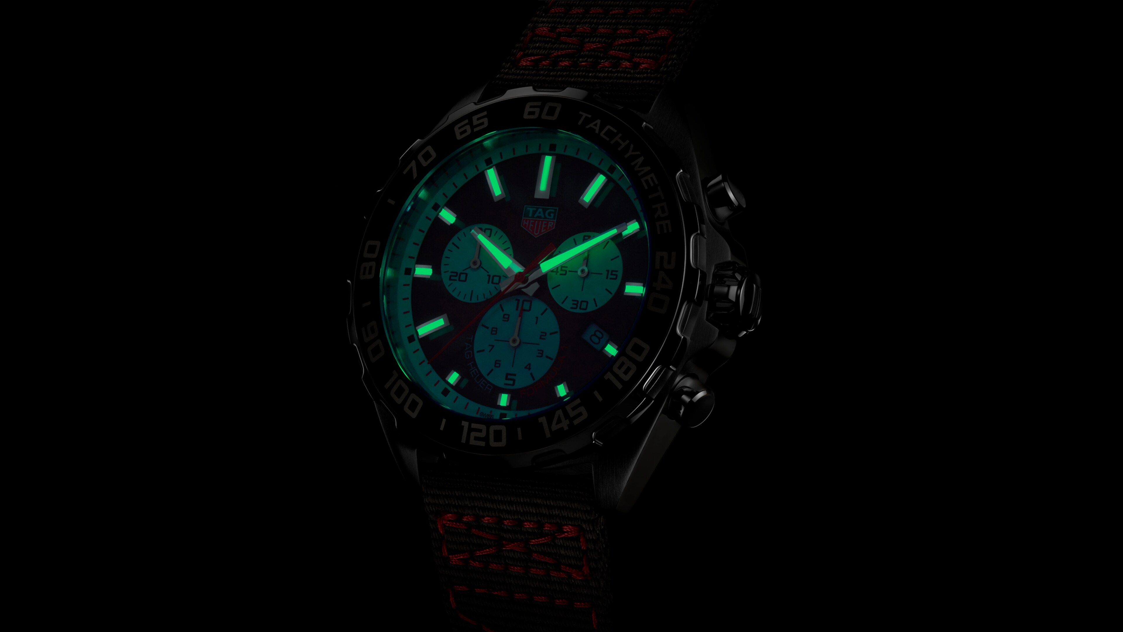 The silver-toned indexes and hour and minute hands are enhanced with white Super-LumiNova®. The red details on the dial and sub-dials are matched by the red top-stitching patterns on the black NATO strap.